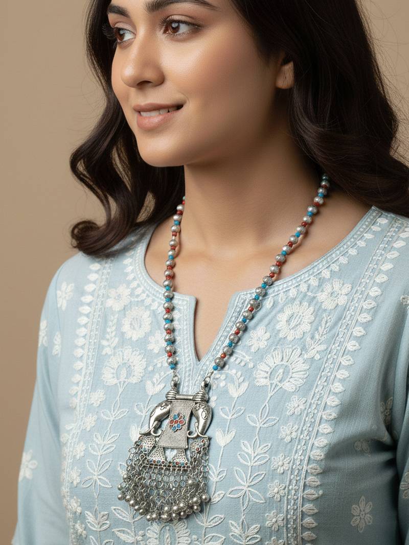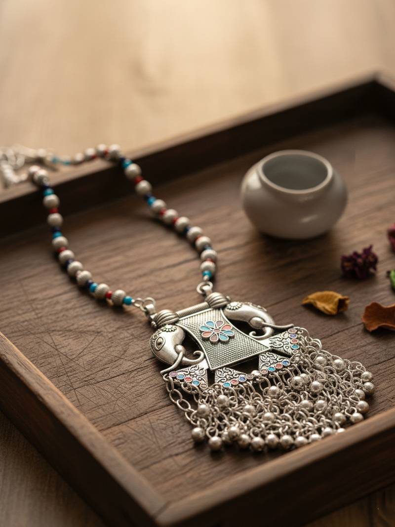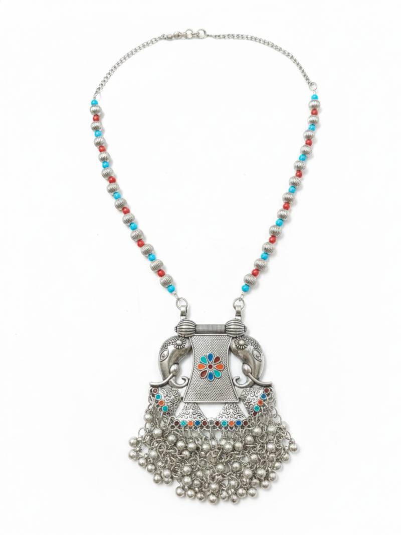 | Product Description | The Nvr Women Traditional Oxidized Elephant Pendant Necklace Is An Ethnic Inspired Piece Of Indian Jewelry Featuring An Intricately Designed Elephant Motif Pendant. Crafted With An Antique Silver Toned Finish, The Large Pendant Is Adorned With Multicolored Enamel Work (Red, Blue, And Green Floral Designs) And Finished With Dangling Metal Ghungroo Bells Along The Bottom Edge. |