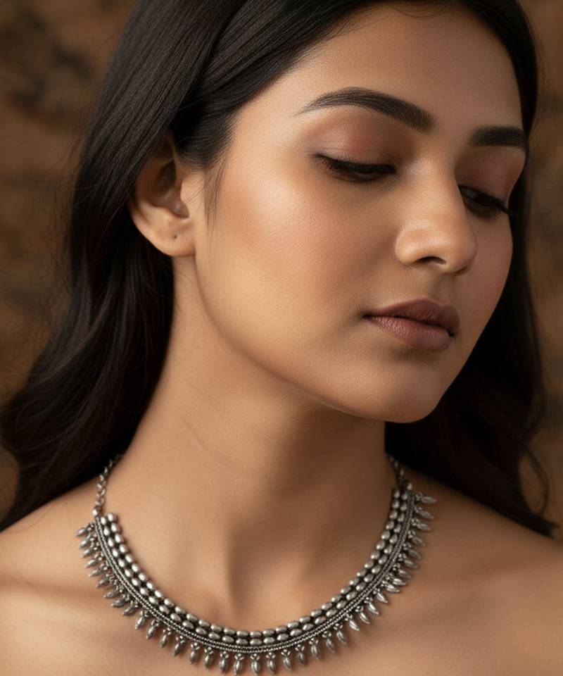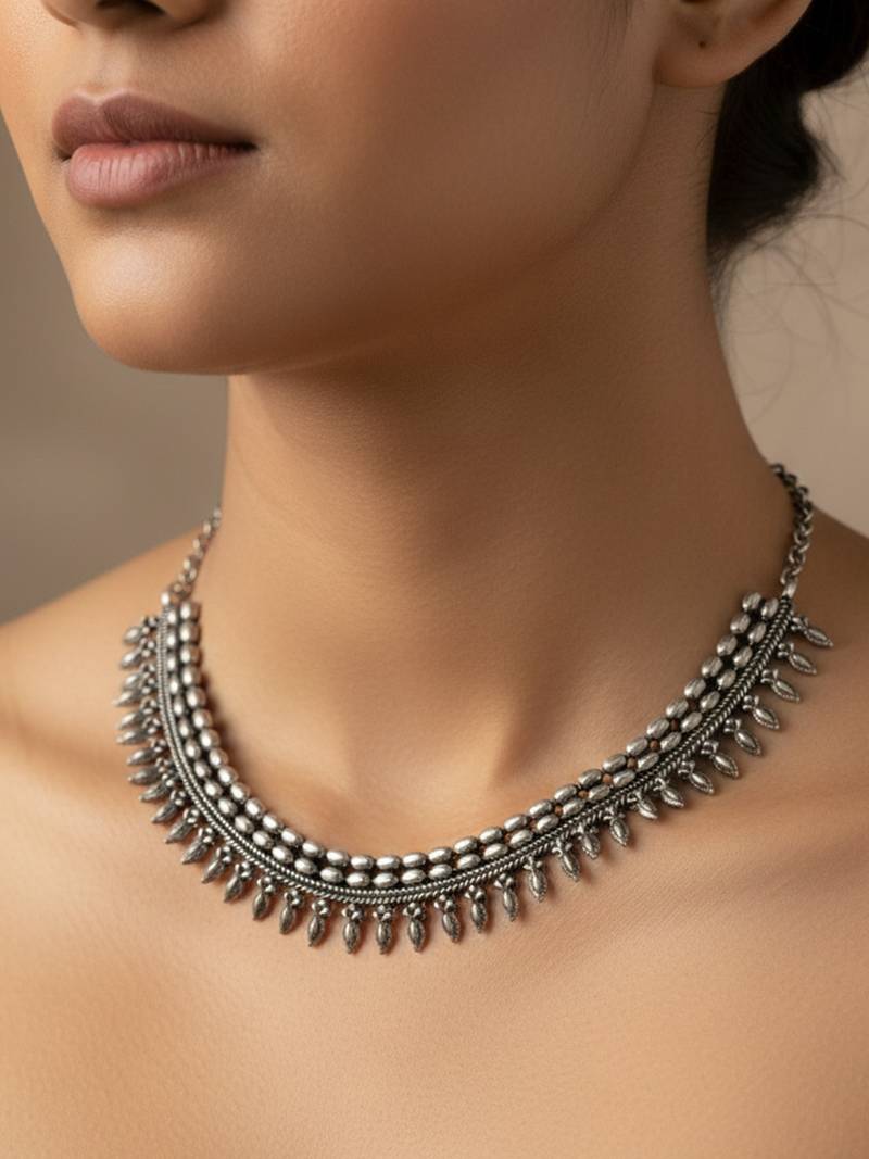 | Product Description | This Item Is An Nvr Women Oxidized Silver Tribal Leaf Choker Necklace For Girls And Women Featuring A Striking Design Of Cascading Teardrop Or Spike Shaped Charms. The Main Body Of The Necklace Is Composed Of Multiple Rows Of Small, Round Metal Beads, Creating A Rich, Layered Effect. Features A Prominent Choker Style With A Fringe Of Pointed, Teardrop, Spike Charms Dangling Along The Bottom Edge, Which Adds Movement And A Unique Aesthetic. Perfect For Those Who Love Ethnic, Tribal, Or Indo Western Statement Jewelry, Suitable For Pairing With Sarees, Lehengas, Or Modern Deep Neck Outfits. |