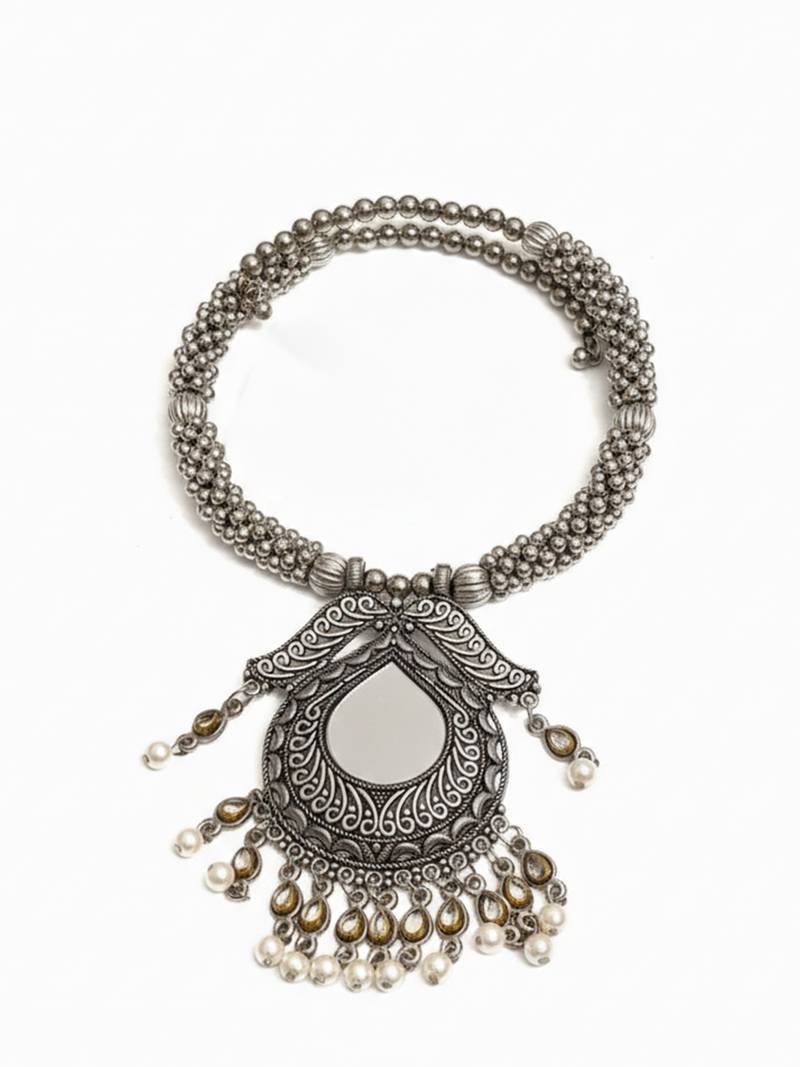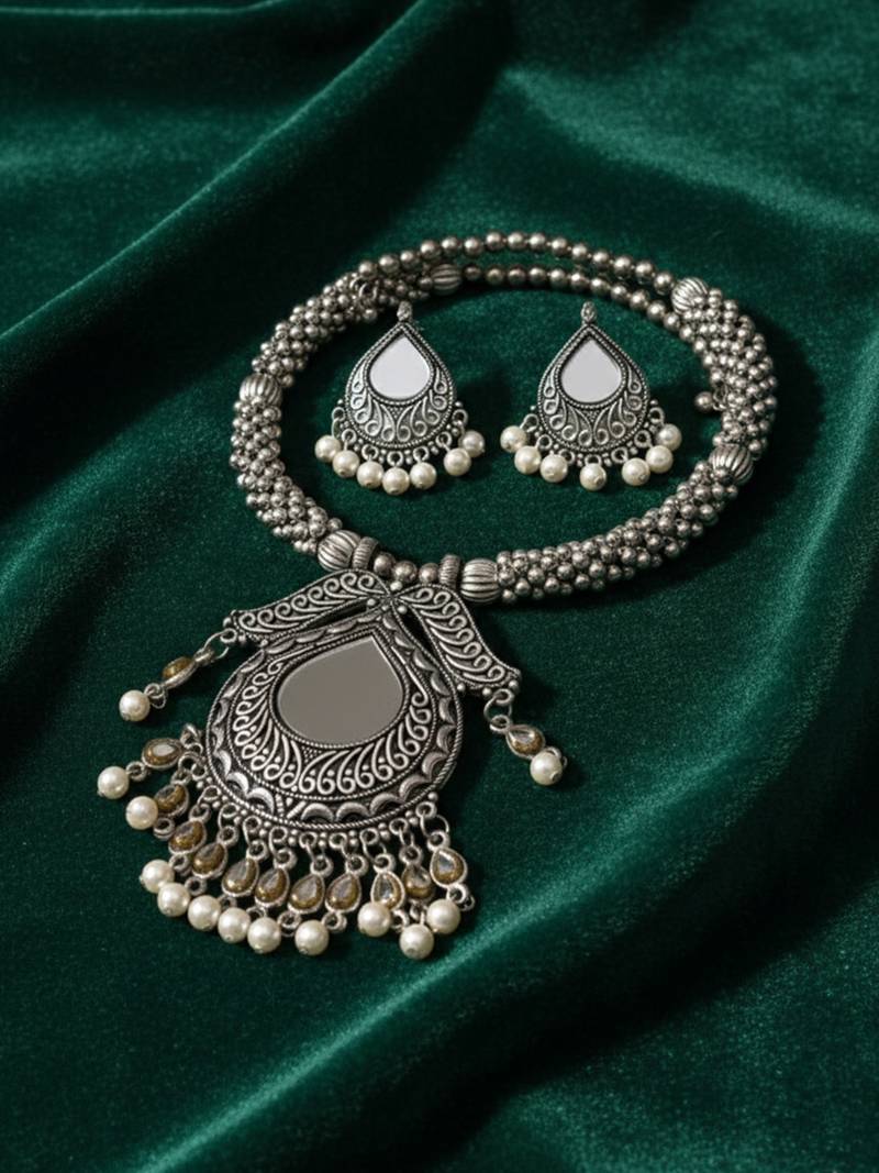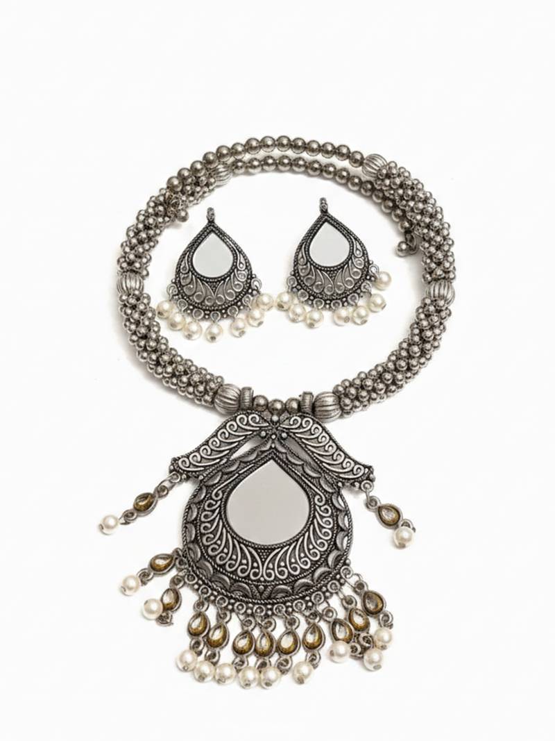| Product Name | Nvr Women Oxidized Silver Tone Mirror & Pearl Ethnic Necklace With Earring Set | |