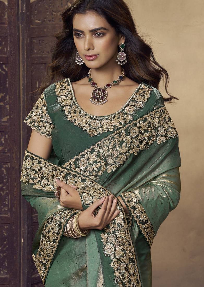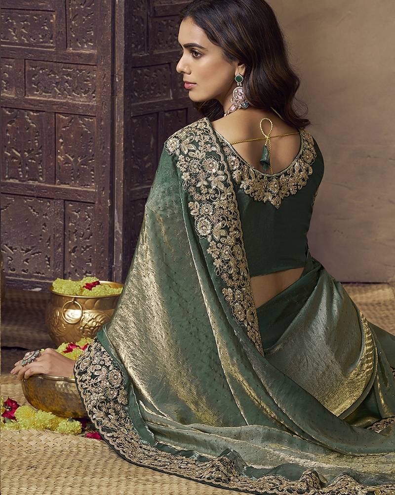 Dark sea green embroidered fendi satin saree with satin blouse fabric || premium sarees || premium fabrics