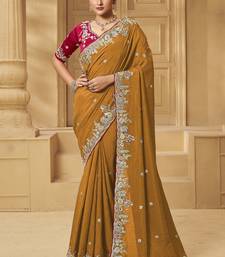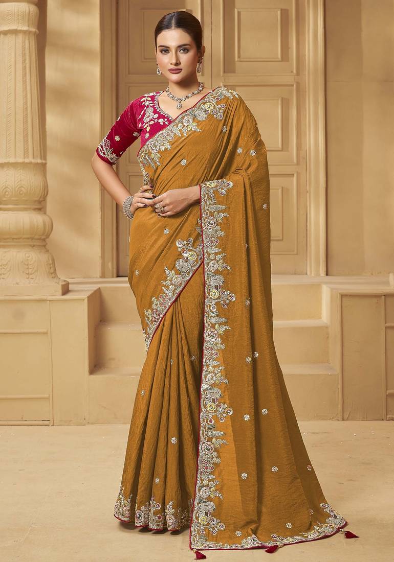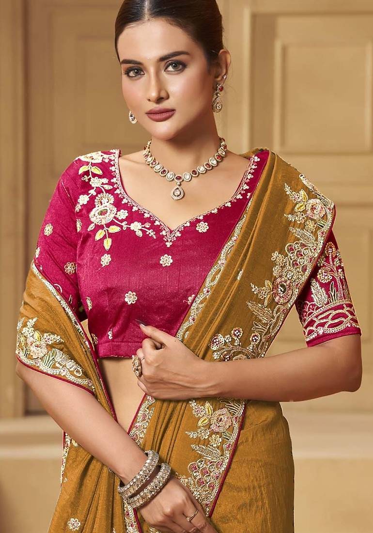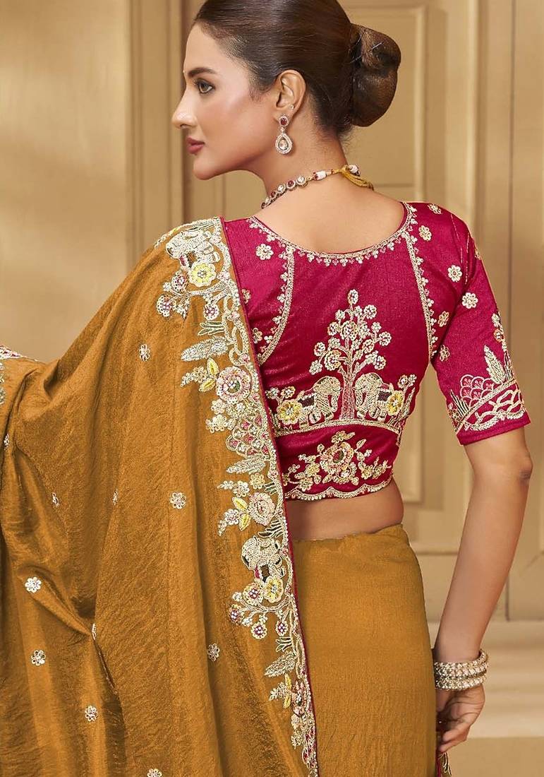 Dark yellow party wear fancy silk saree with designer blouse fabric