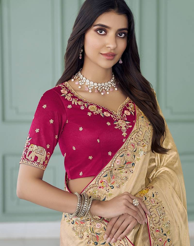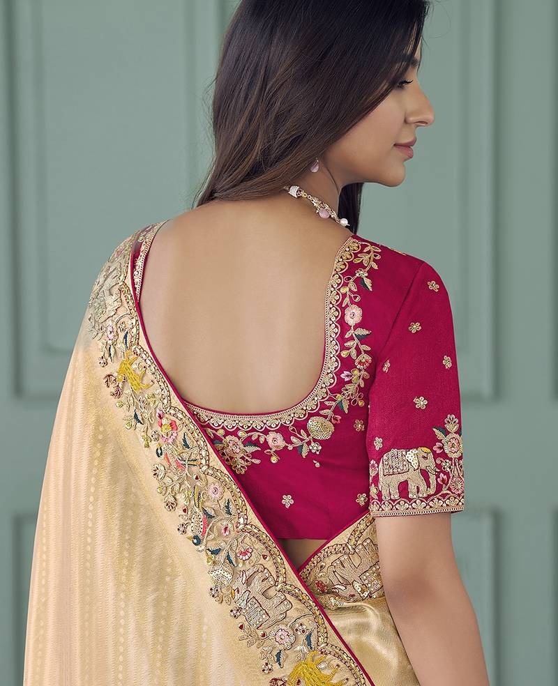 Gold embroidered jacquard silk blend wedding saree with blouse fabric