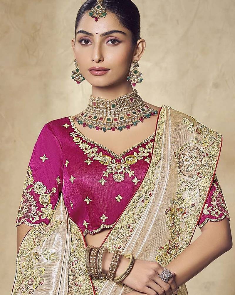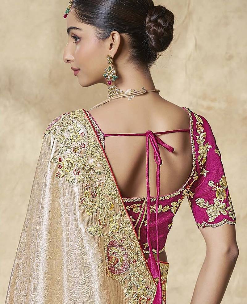 Gold embroidered jacquard silk blend wedding saree with blouse fabric