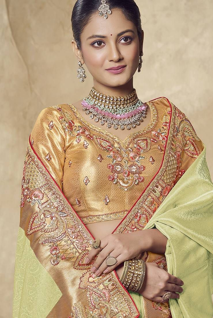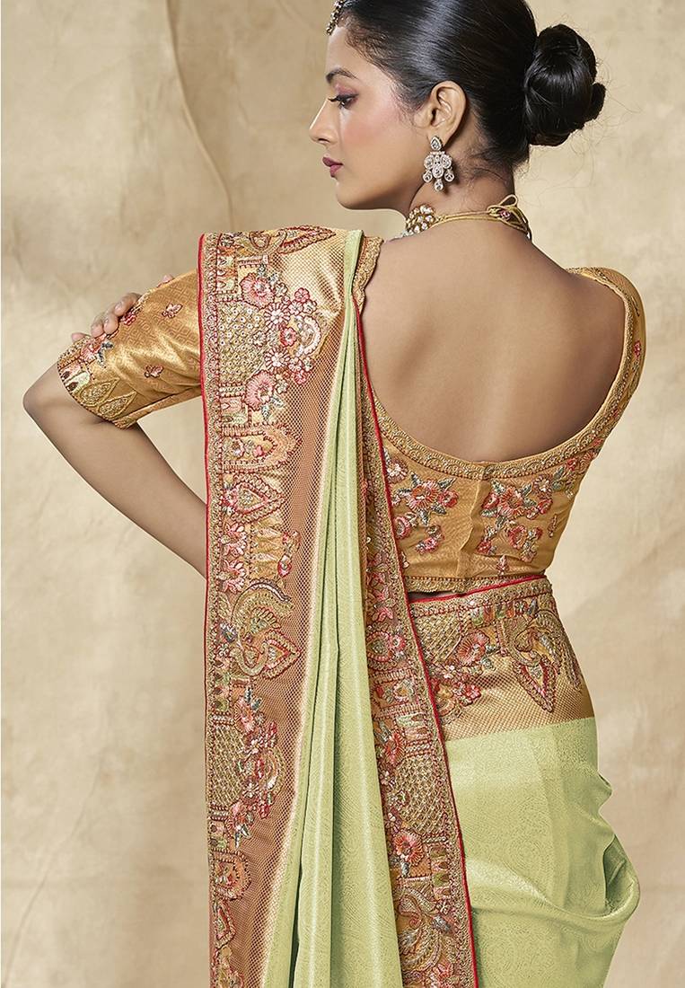 Light green embroidered jacquard silk blend wedding saree with blouse fabric