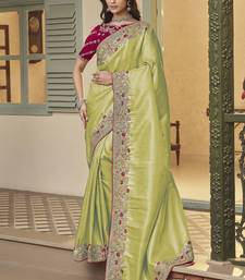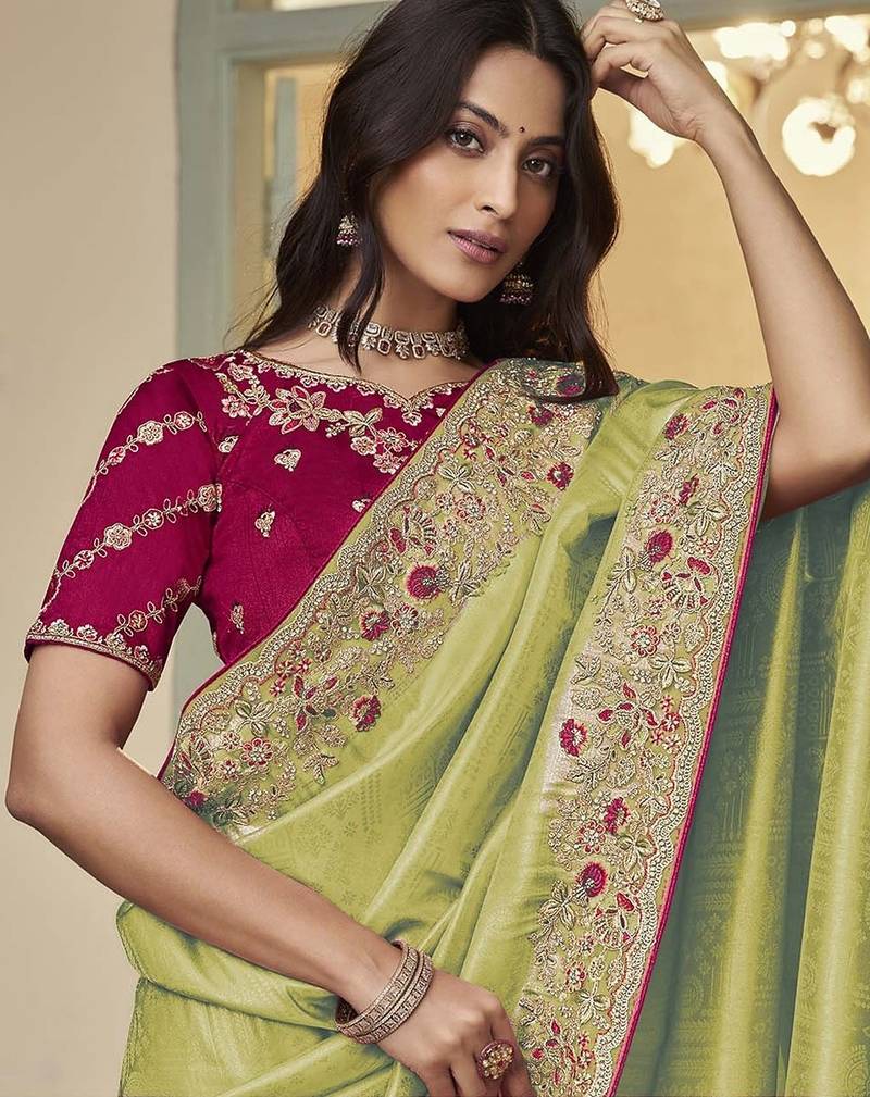 Light green embroidered jacquard silk blend wedding saree with blouse fabric