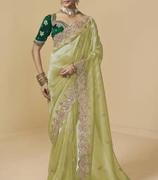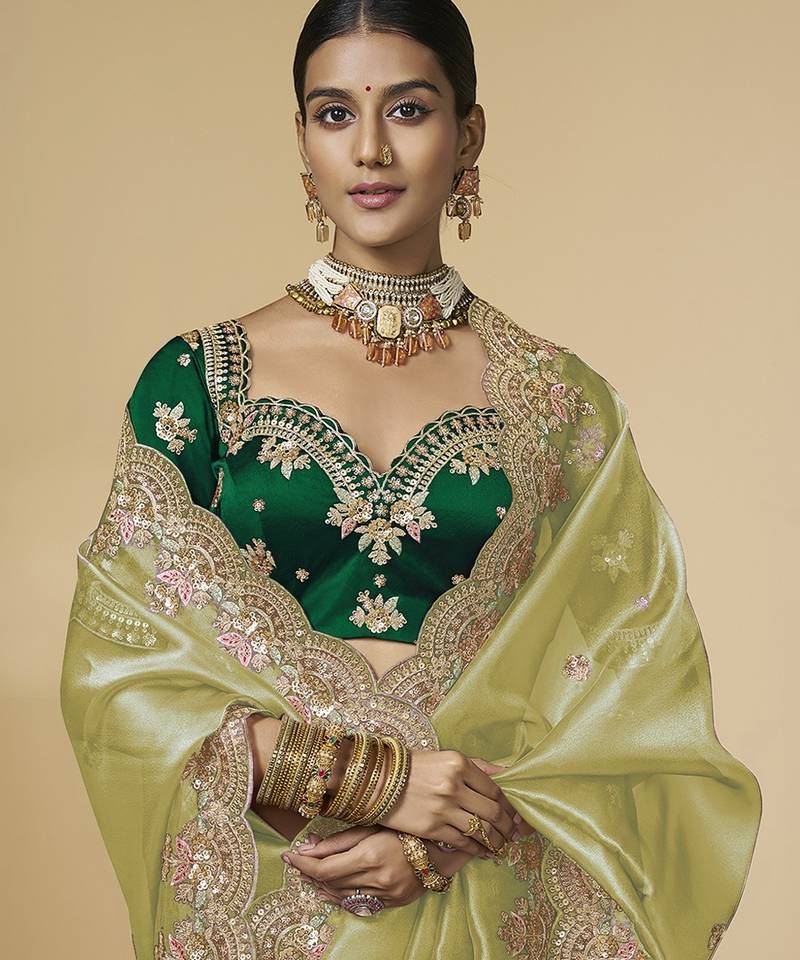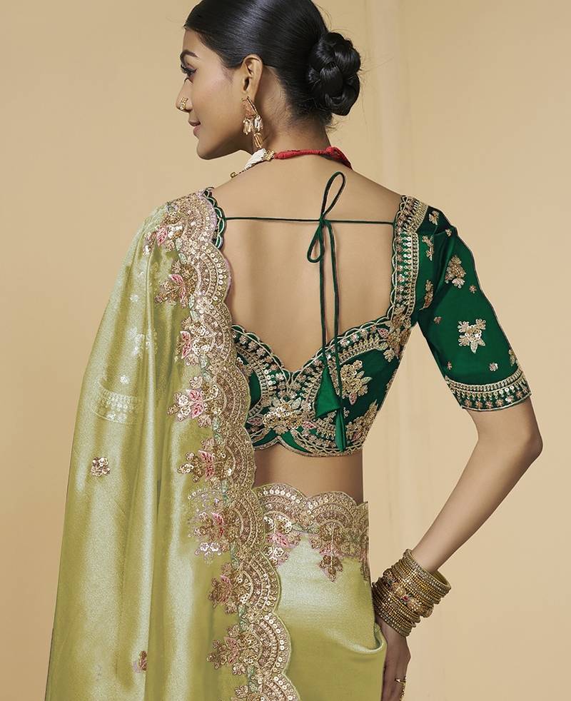 Light green (pista) embroidered tissue party wear saree with designer blouse fabric