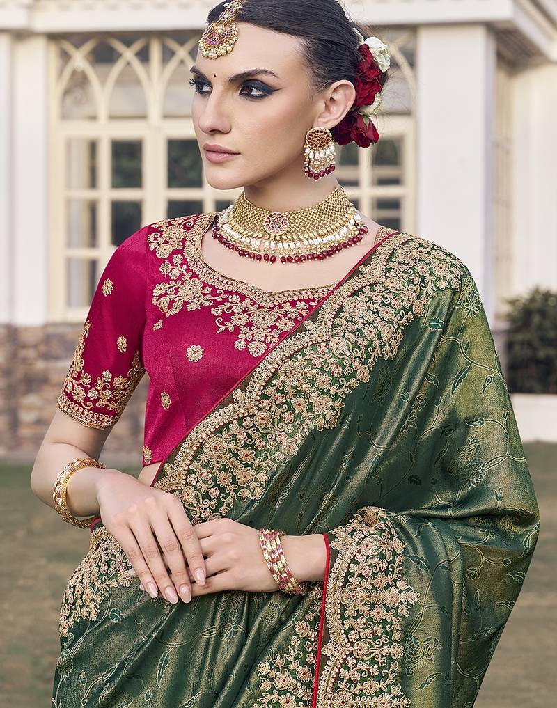 | • | Saree | : | Color- Mehendi / Fabric- Jacquard |