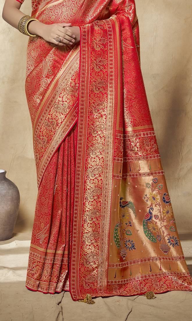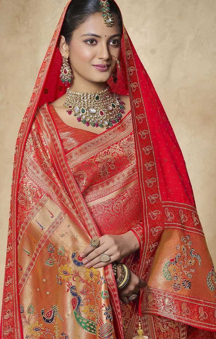 Red bridal silk blend saree wih jharkans with blouse fabric