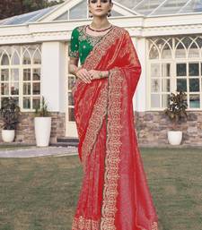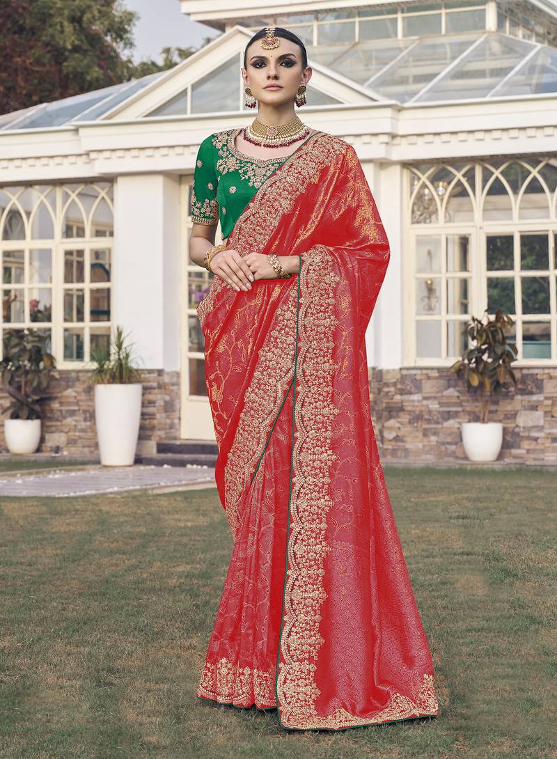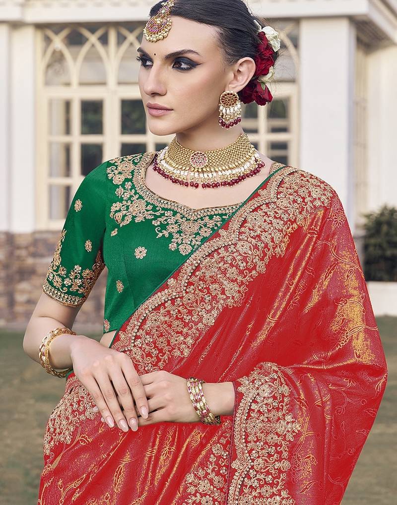 Red party wear jecquard saree with designer blouse fabric