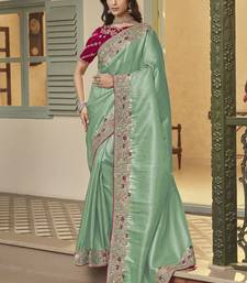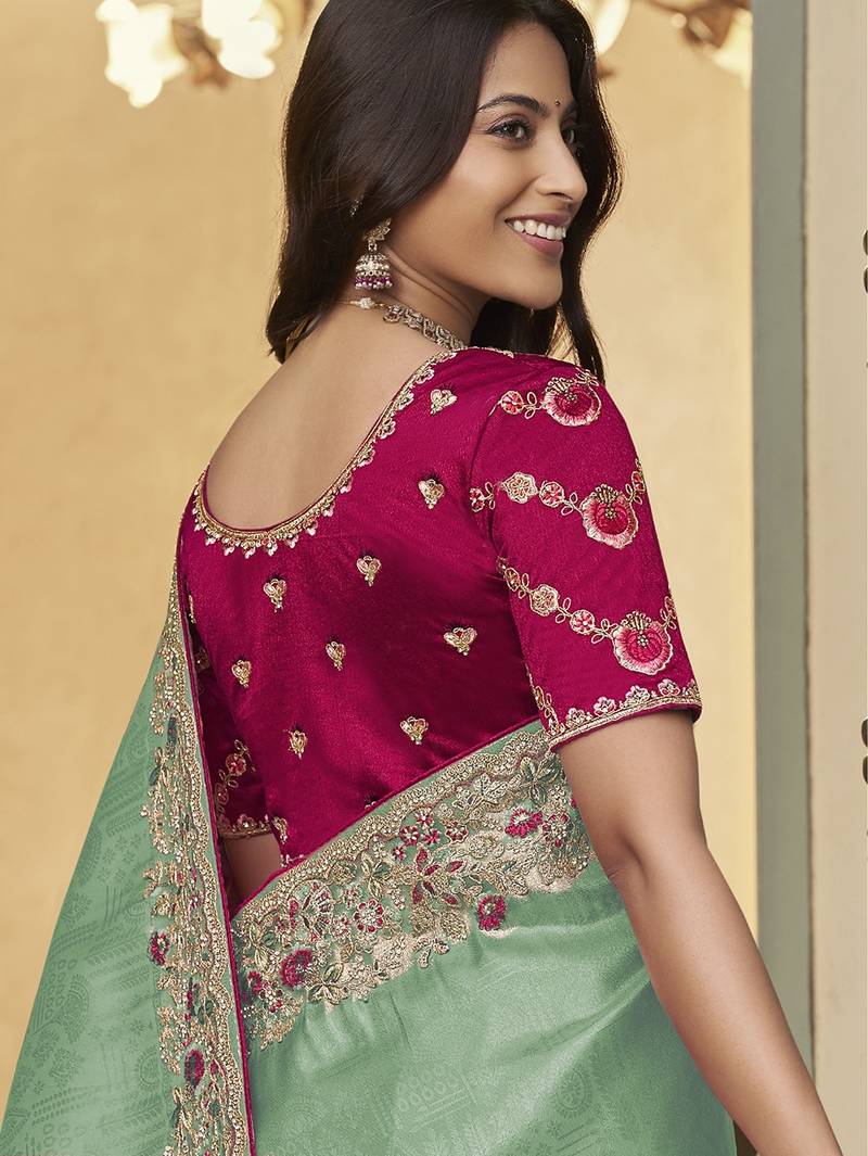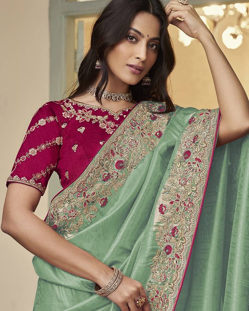 Sea green embroidered jacquard silk blend wedding saree with blouse fabric