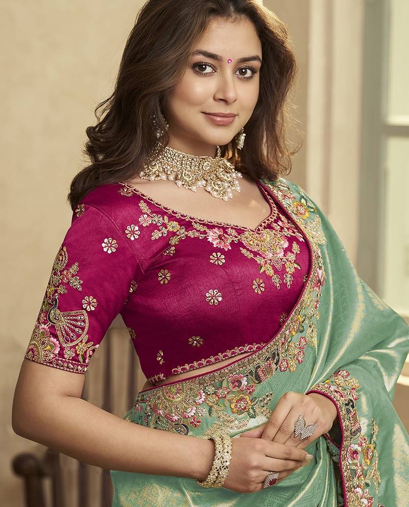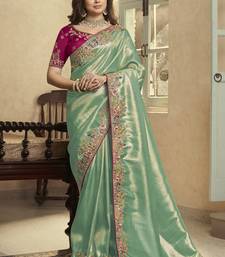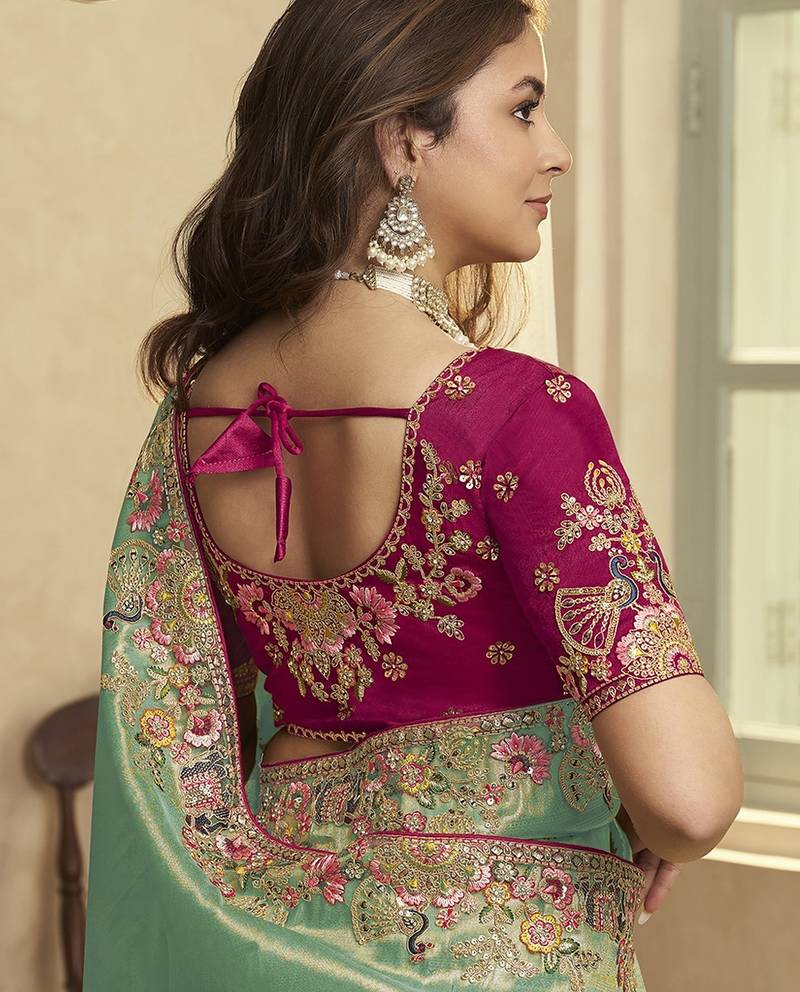 Sea green embroidered jacquard silk blend wedding saree with blouse fabric
