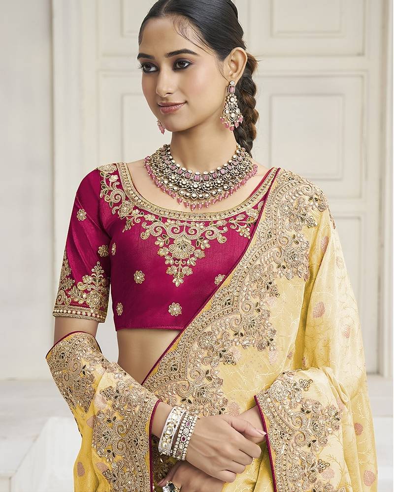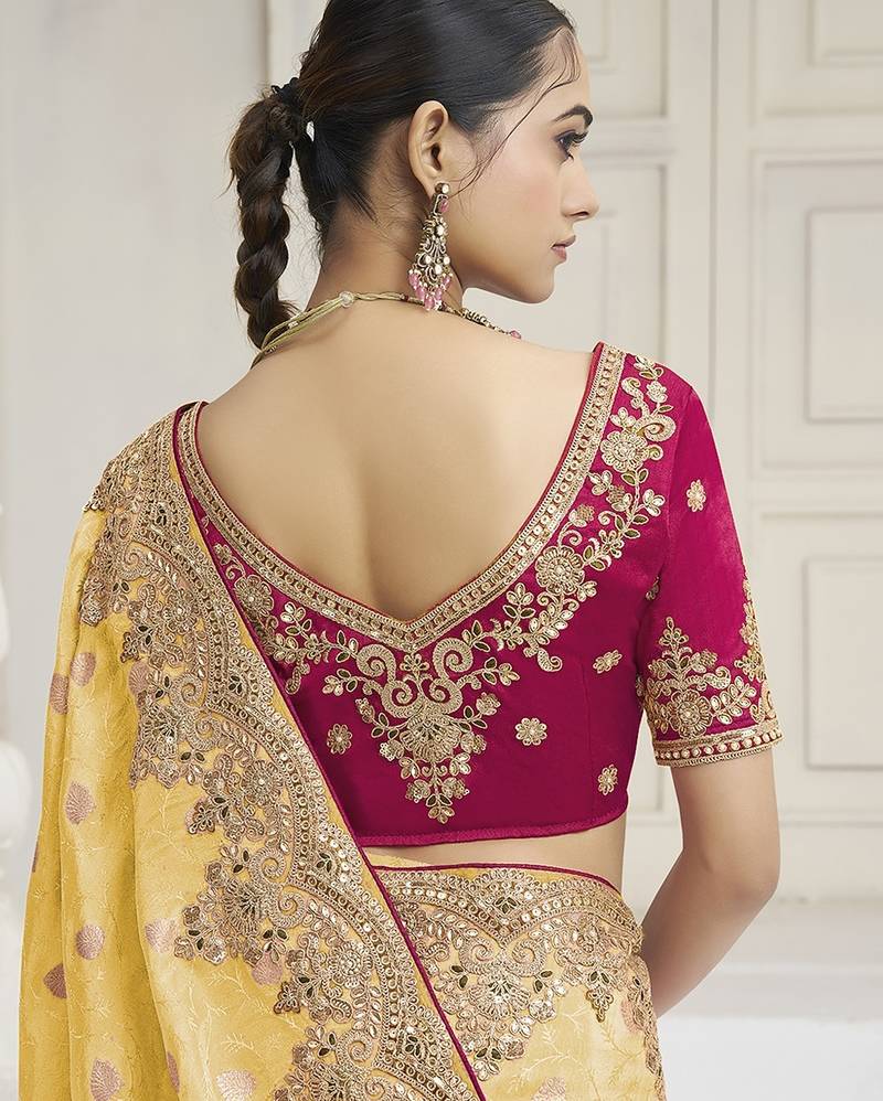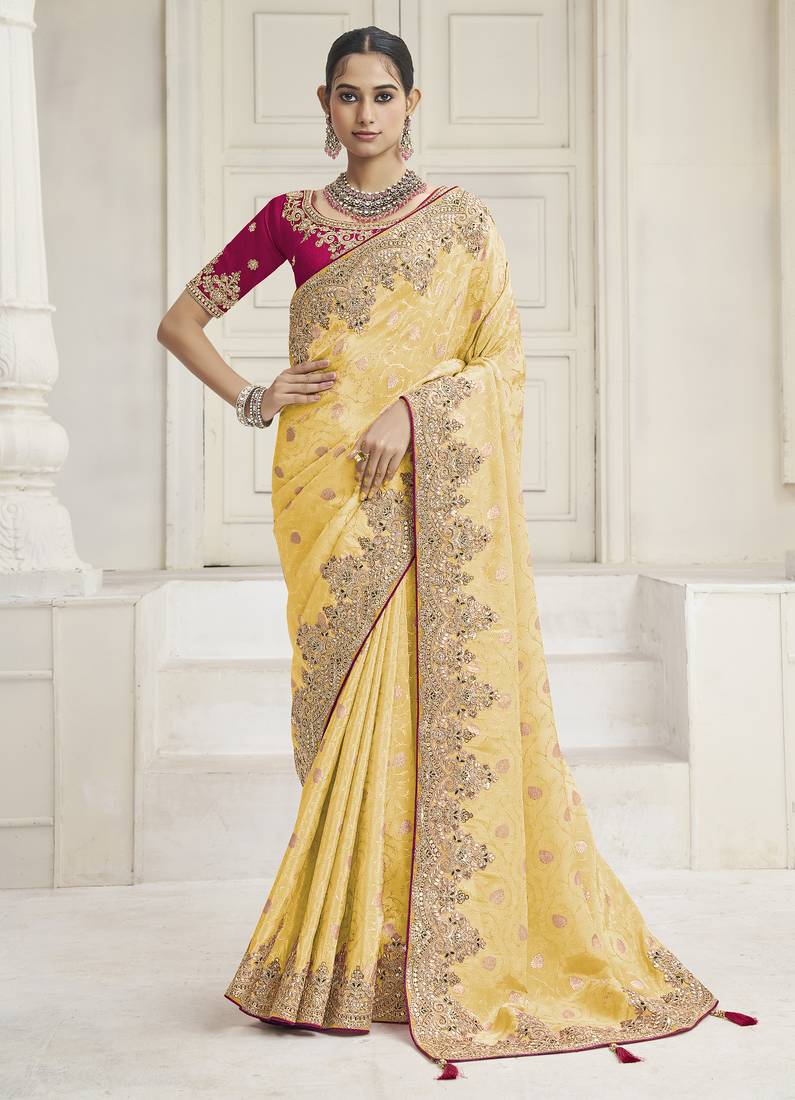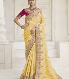 Yellow party wear tissue vicose saree with designer blouse fabric