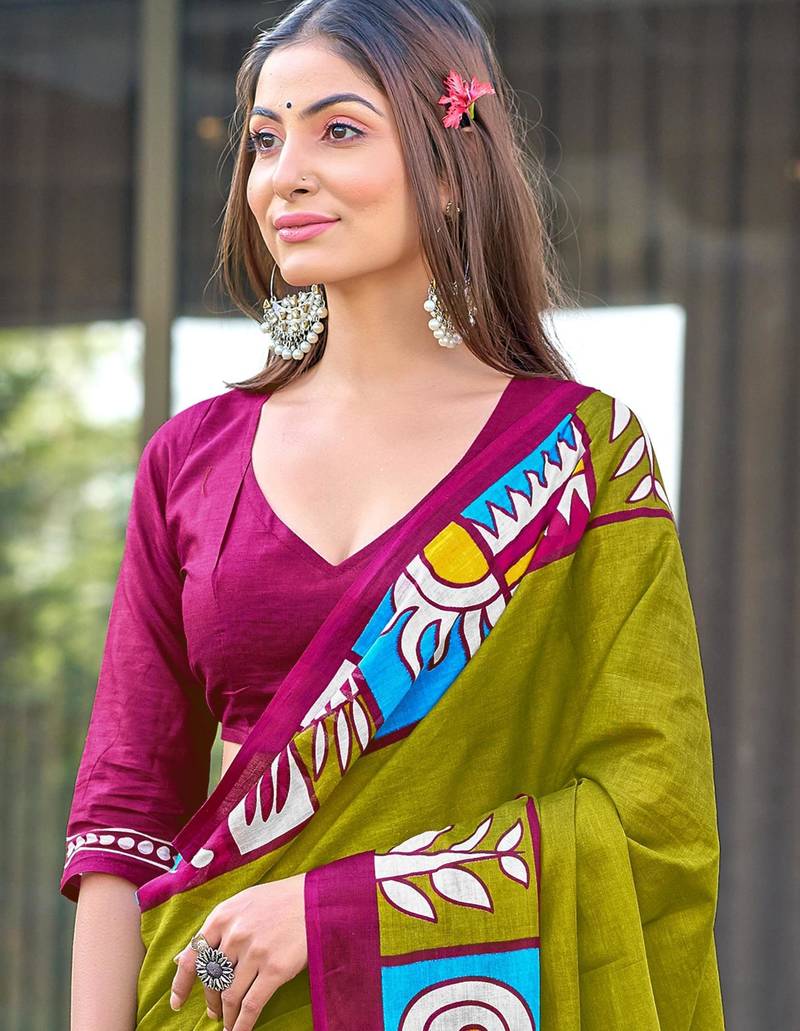 Product Description | Mehendi Soft Cotton Printed Fancy Saree With Blouse |