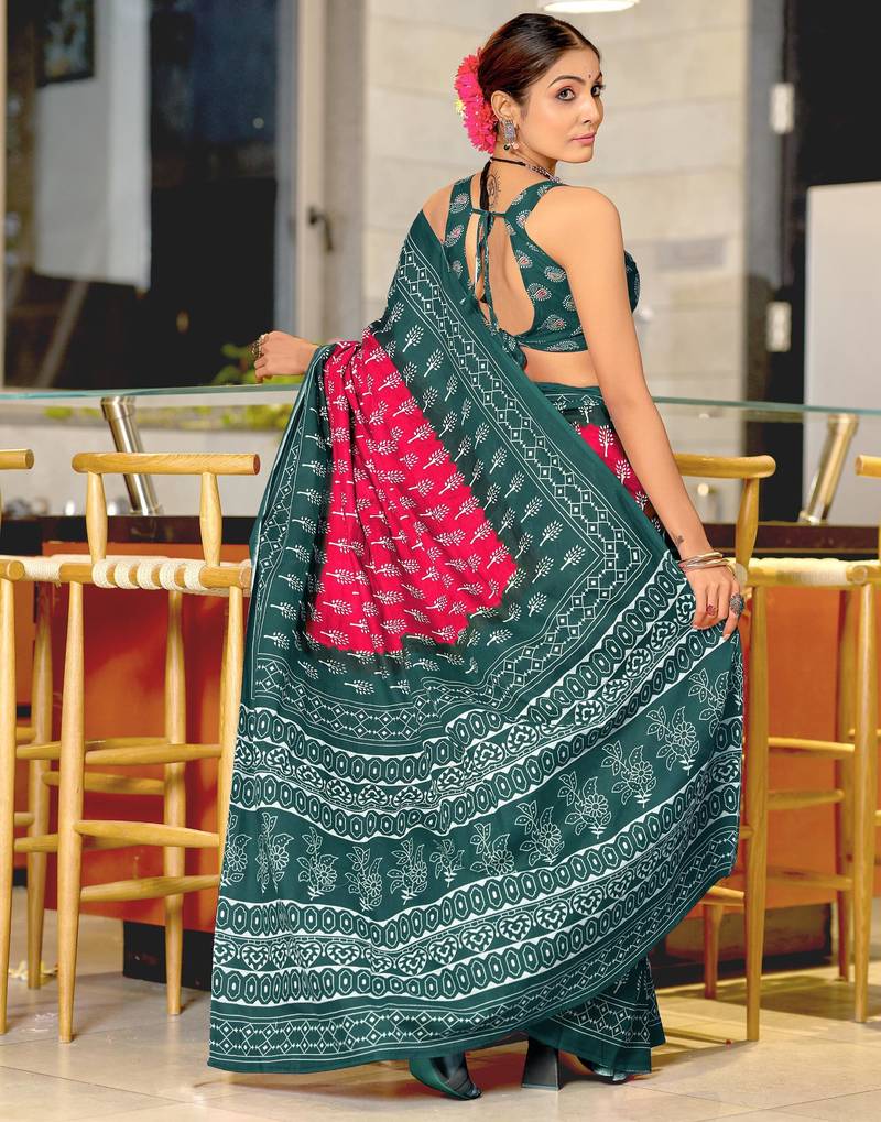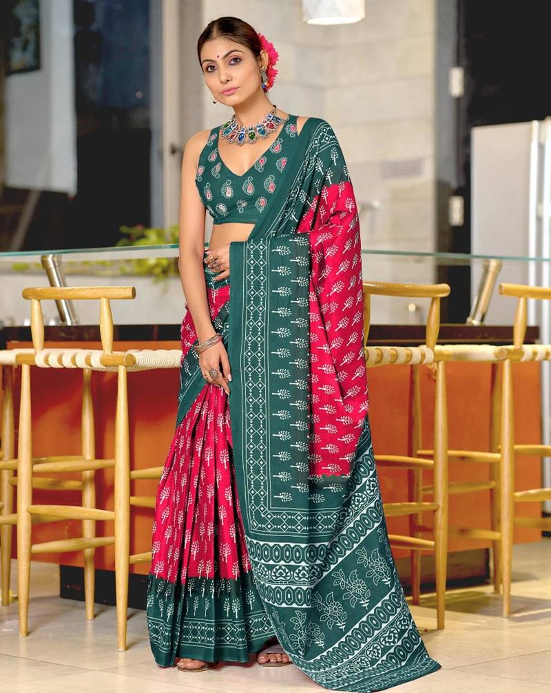 Product Description | Pink Soft Cotton Printed Fancy Saree With Blouse |