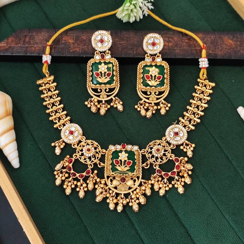 | Product Description | Beautiful Antique Temple Necklace Set With Floral Design, Green Enamel Accents, Red Stones, And Intricate Detailing, Paired With Matching Earrings, Ideal For Festive And Wedding Wear. |
