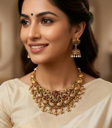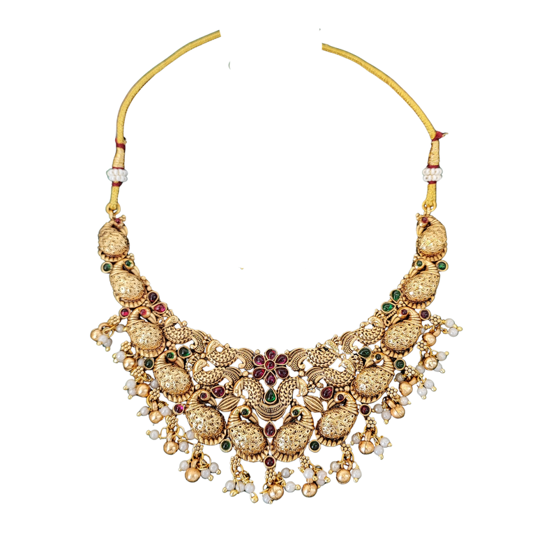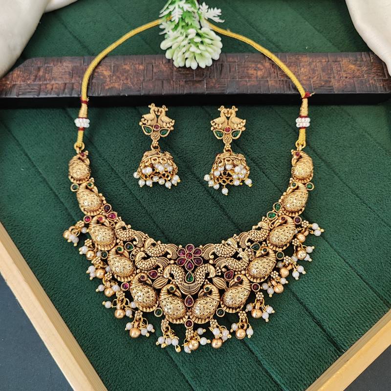 | Product Description | Stunning Antique Temple Necklace Set With Peacock Design, Ruby Green Stones, Pearl Drops, And Intricate Detailing, Paired With Matching Jhumka Earrings For Weddings And Festive Occasions. |