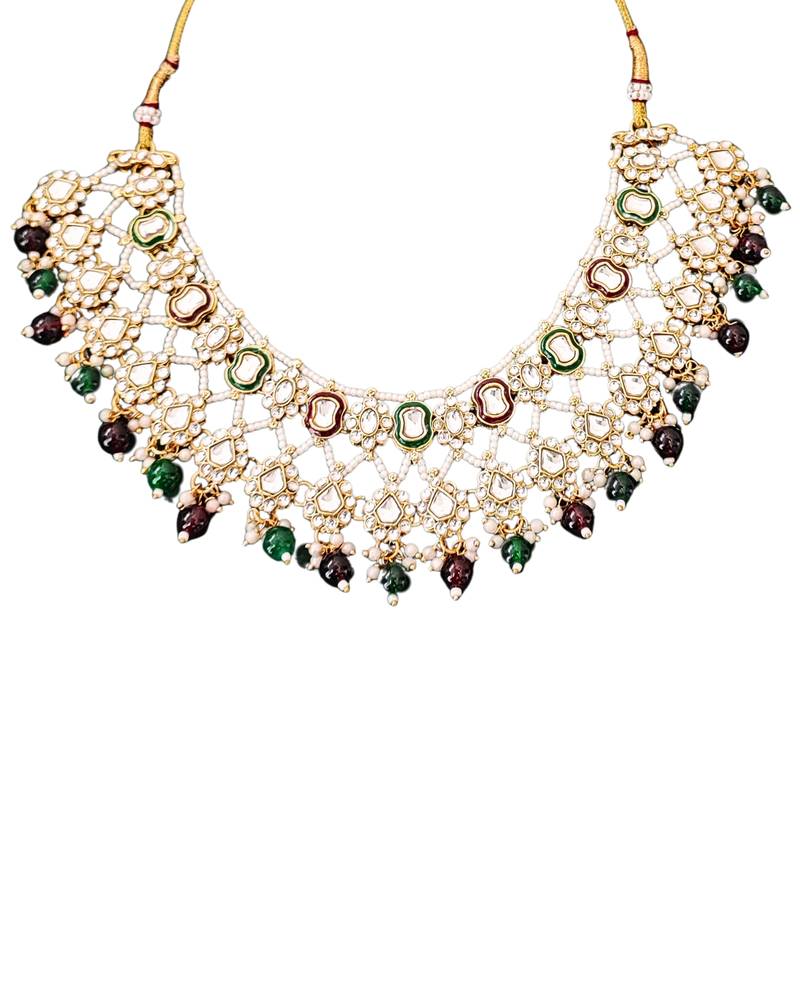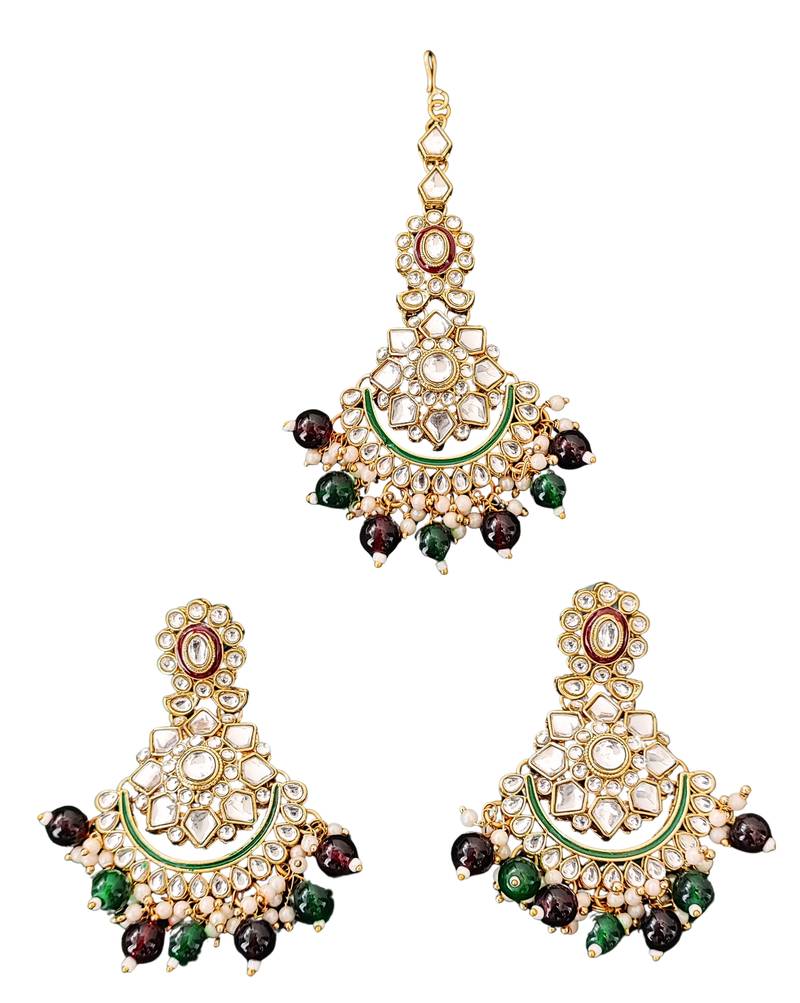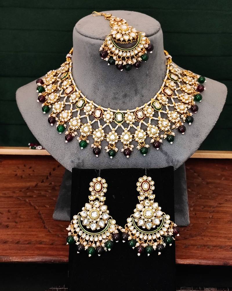 | Product Description | Add A Royal Touch To Your Ethnic Look With This Exquisite Kundan Bridal Necklace Set. Designed With Green And Maroon Beads, It Perfectly Complements Wedding And Festive Outfits. *Includes Necklace, Earrings, And Maang Tikka