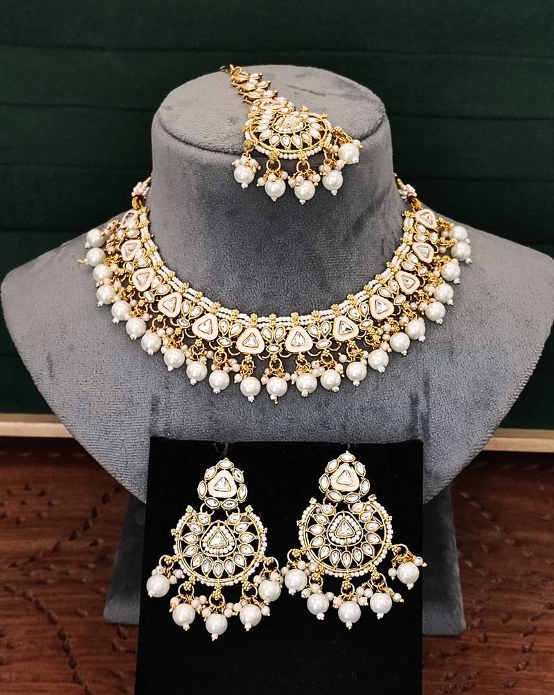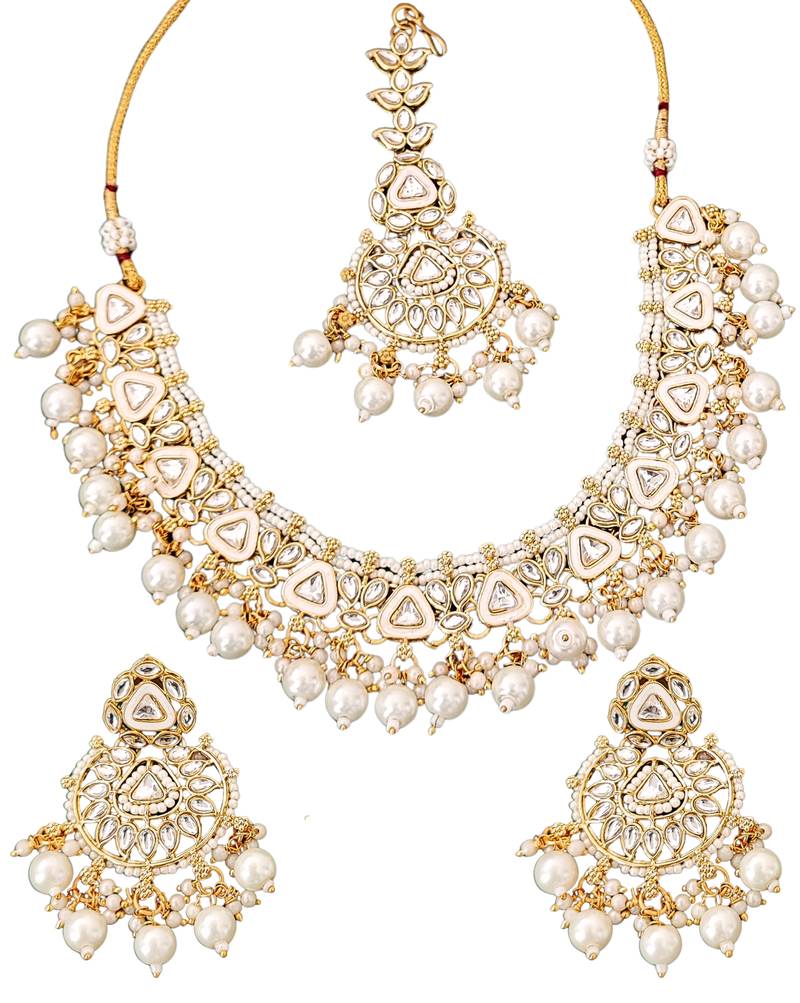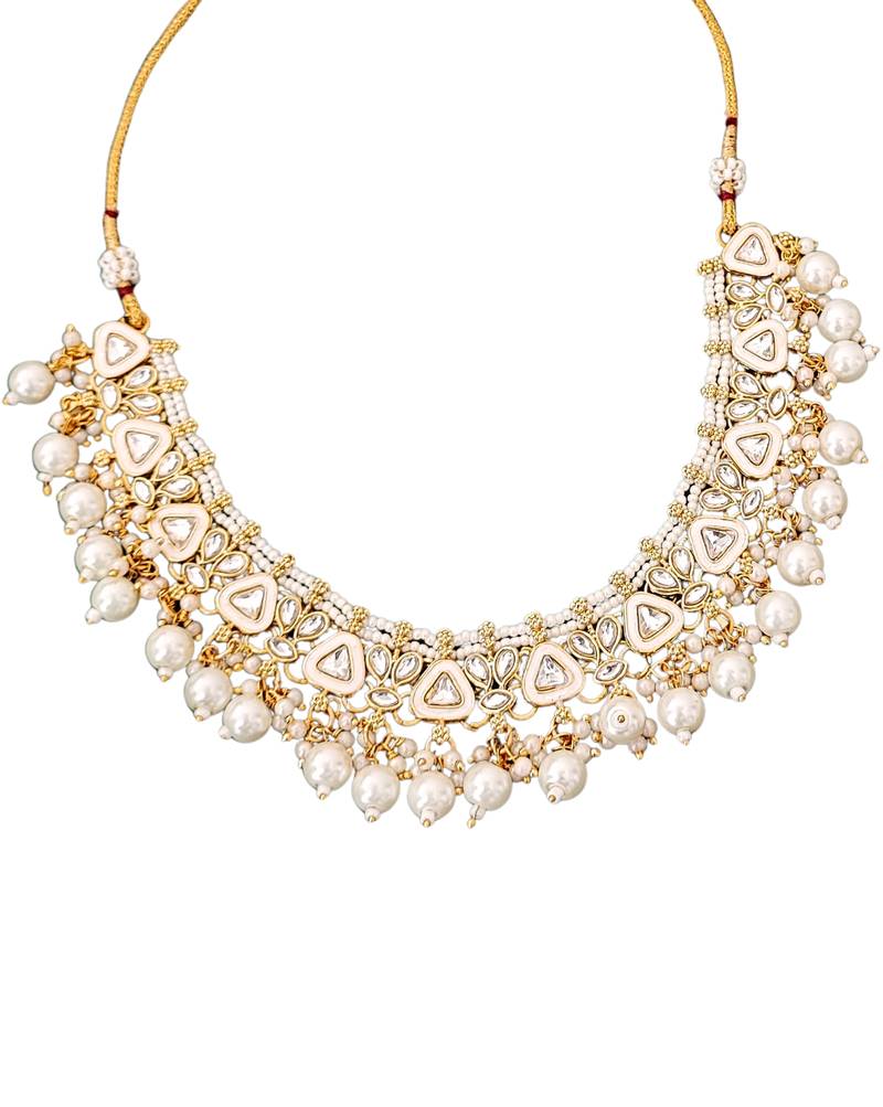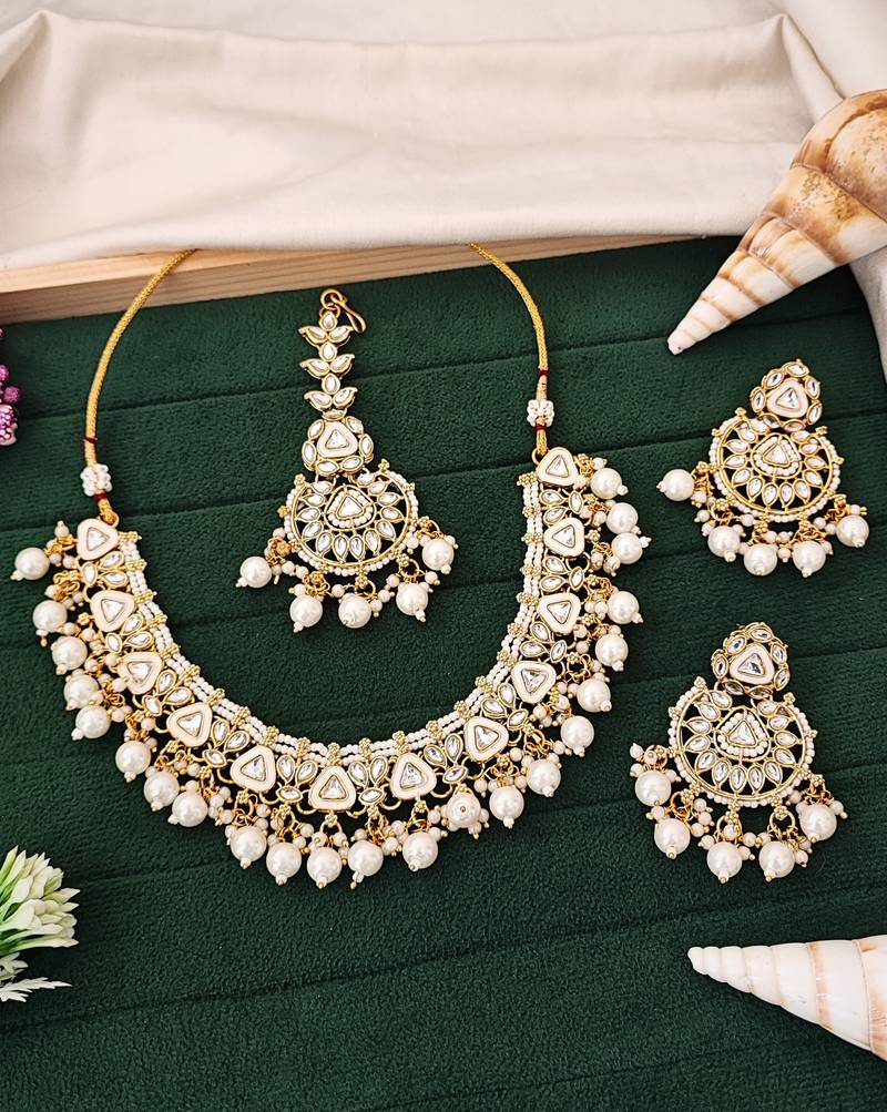 Adorn Your Look With This Exquisite Pearl And Kundan Necklace Set, Featuring Exceptional Craftsmanship And A Radiant Gold Finish. Designed To Complement Both Contemporary And Ethnic Outfits, This Jewelry Set Is Ideal For Weddings, Festive Celebrations, And Grand Occasions. The Combination Of Luminous Pearls And Glittering Kundan Stones Adds A Regal Charm, Enhancing Your Neckline With Timeless Beauty. It Offers A Perfect Balance Of Elegance, Luxury, And Comfort For All Day Wear.