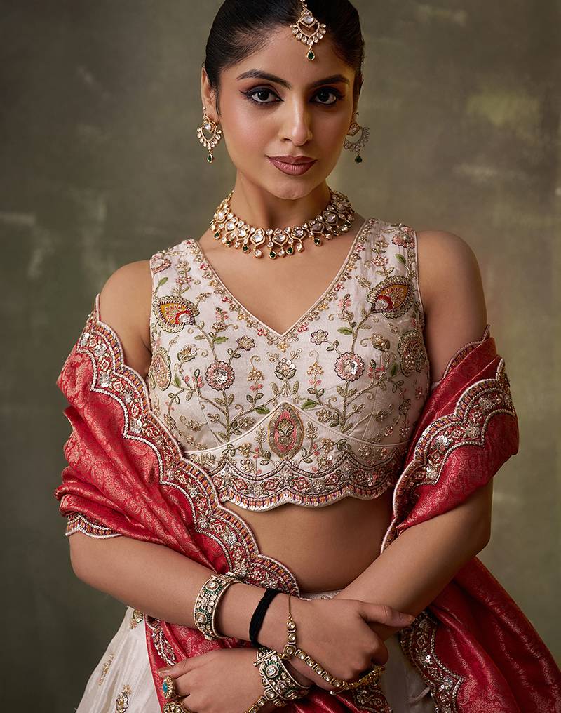 Beige tissue fabric sequins and thread embroidery semi-stitched lehenga set with blouse and red dupatta