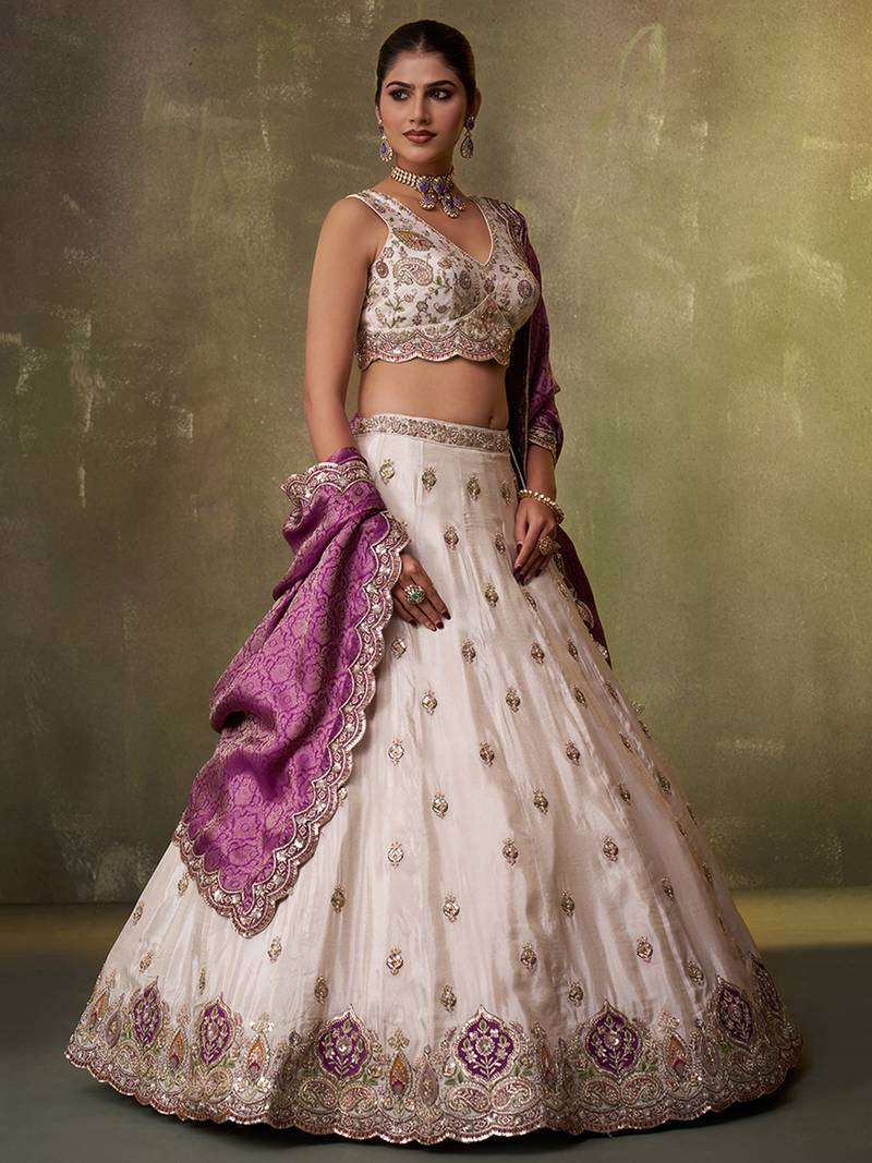 Beige tissue fabric sequins and thread embroidery semi-stitched lehenga set with blouse and pink dupatta