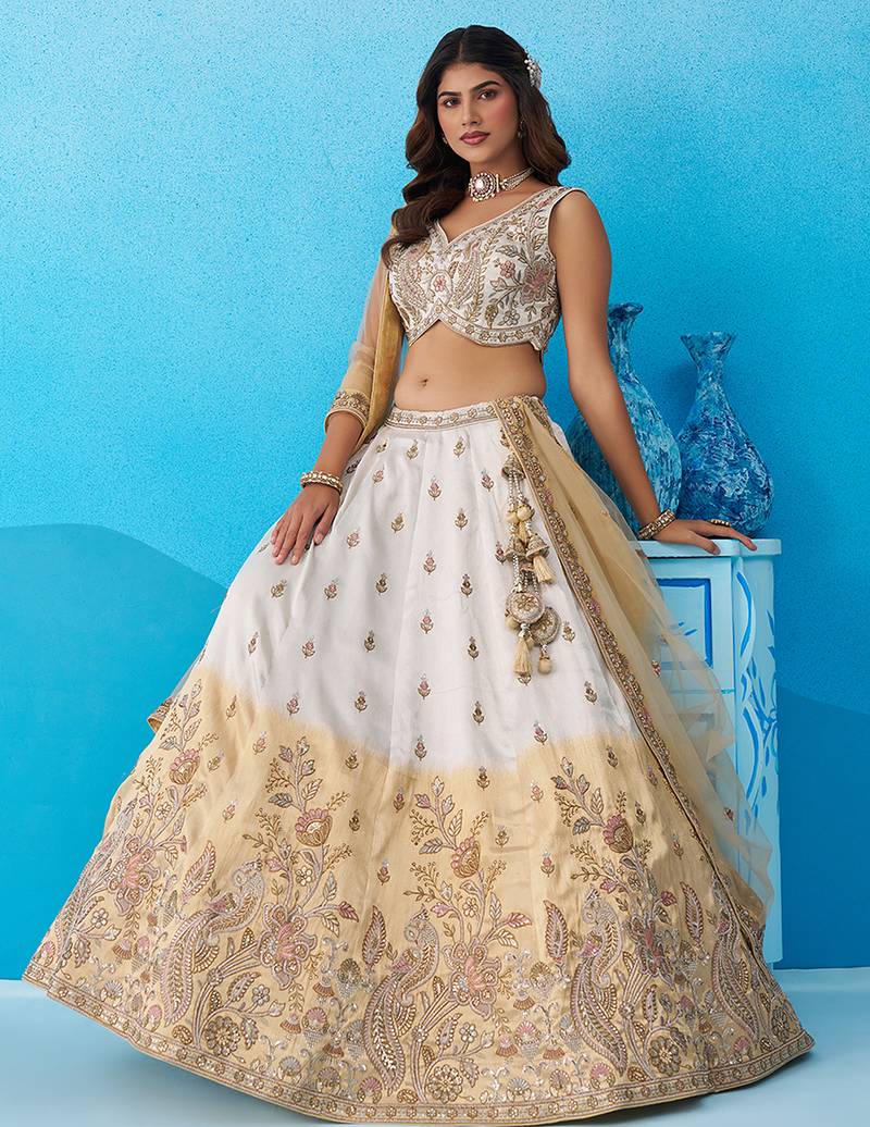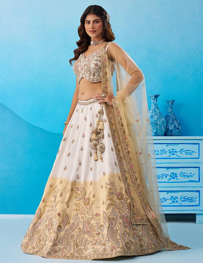 | Product Description | • Lehenga : Elegant Semi Stitched Lehenga Set Crafted In Premium Ombre Beige And Cream Tissue Fabric With Heavy Beads & Sequins And Embroidery Work. The Lehenga Features A 4.3 Meter Flair With A Colourful Heavy Border On The Hemline And Is Supported With Double Shantoon Inner, Can Can 12 & 18 Inches And Buckram 4 And 12 Inches For A Perfect Shape.