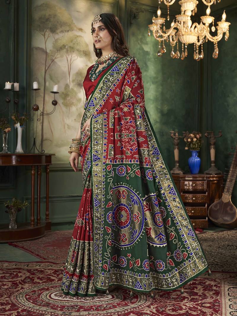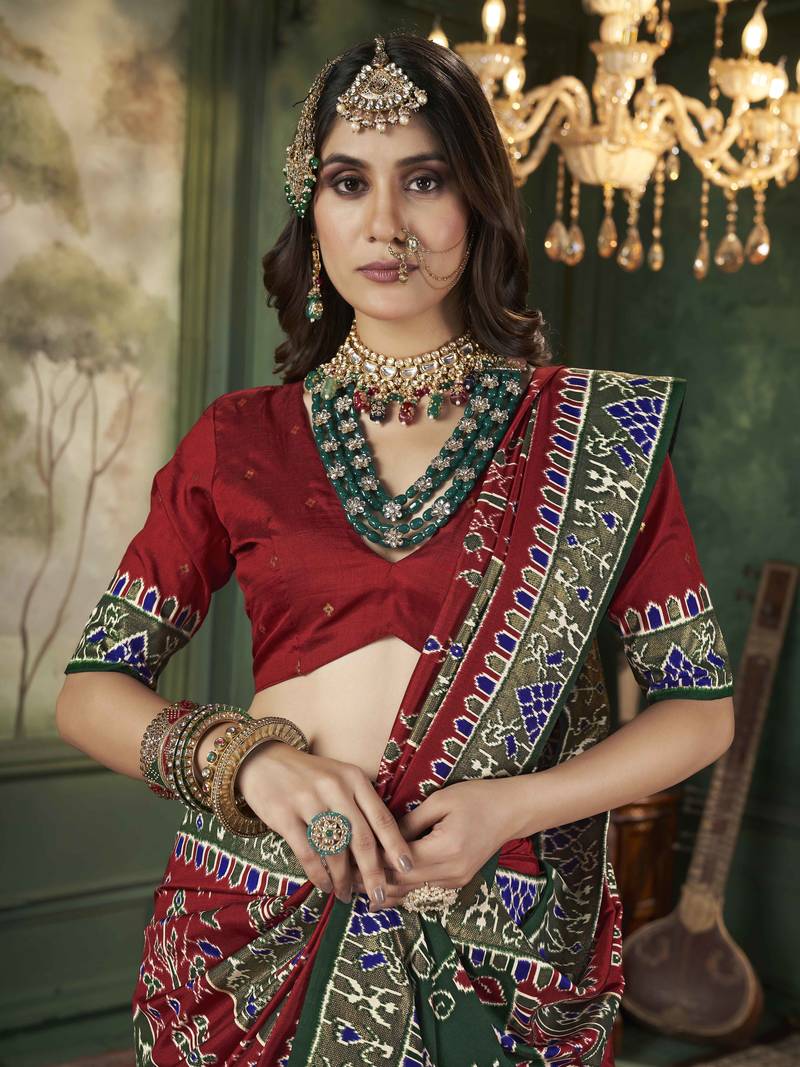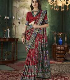 Maroon woven designer with ikkat printed tussar silk saree with blouse piece