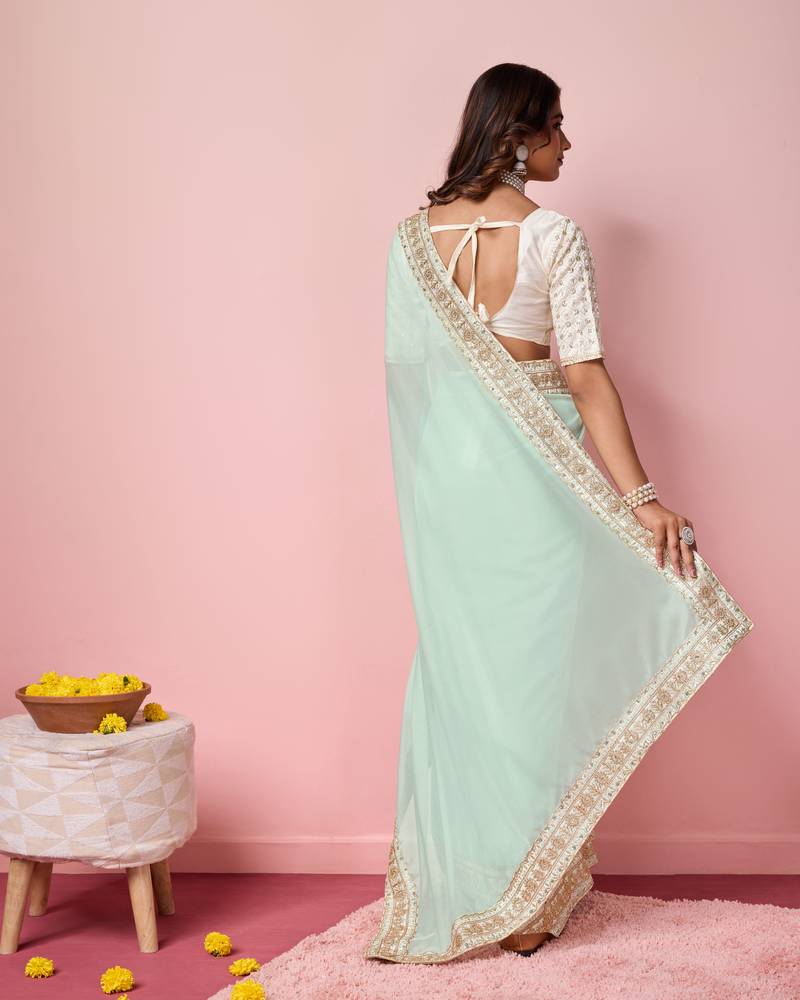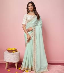 Sea green embroidery work border,blouse organza saree with blouse piece