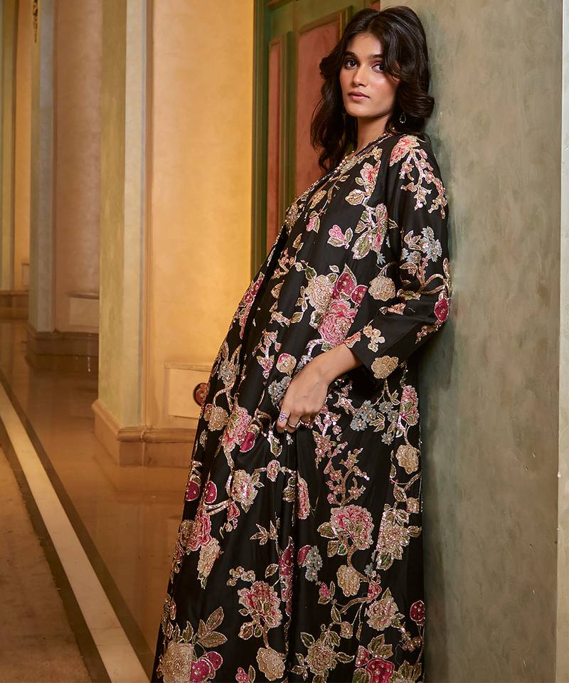 Product Description | A Striking Black Three Piece Ensemble Featuring A Deep V Neck Printed Blouse And A Matching Printed Kali Jacket, Both Intricately Hand Embroidered With Multicolored Zardozi Work. The Richly Embellished Layers Are Paired With A Palazzo, Creating A Bold Yet Elegant Silhouette—Perfect For Festive Occasions And Modern Wedding Celebrations.