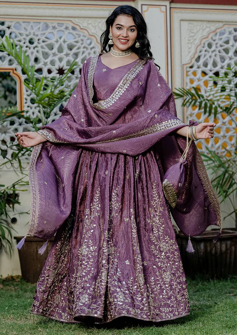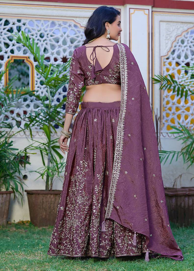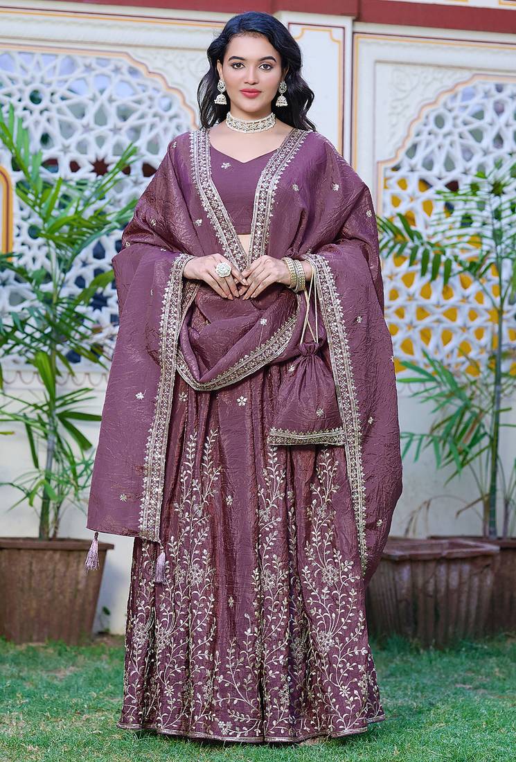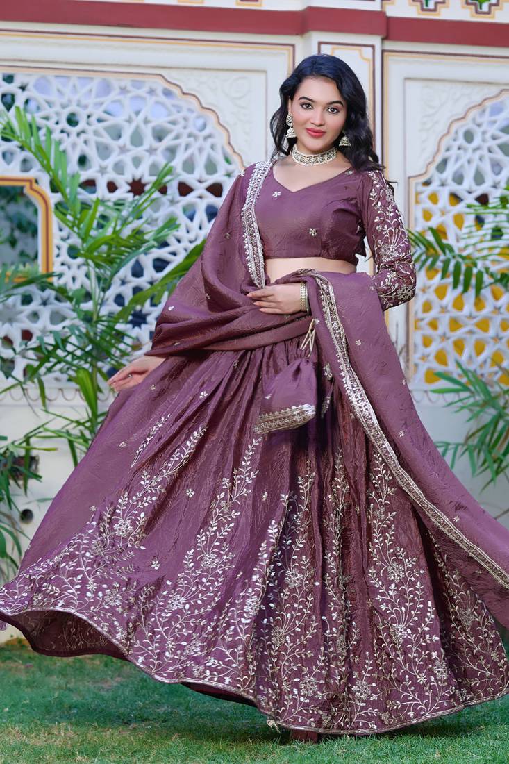Lavender - gold crush fabric sequins embroidery semi-stitched lehenga & unstitched blouse dupatta with bag