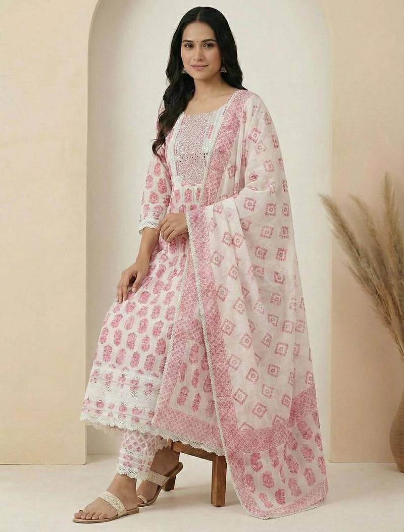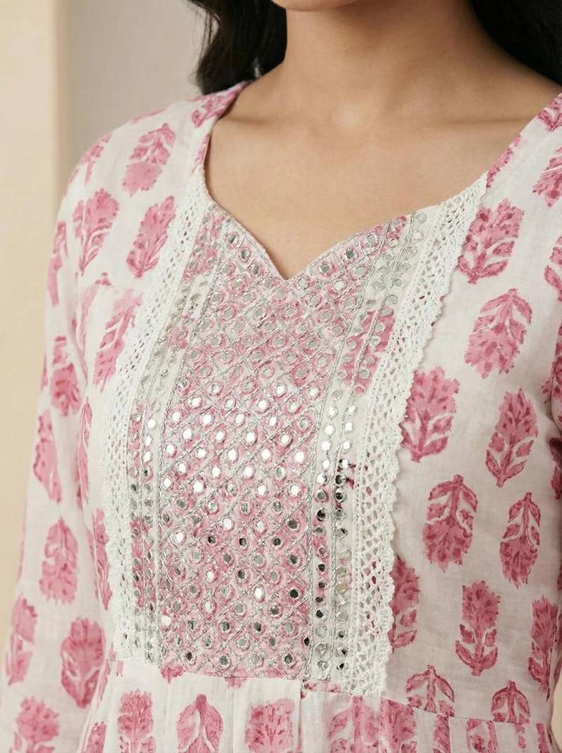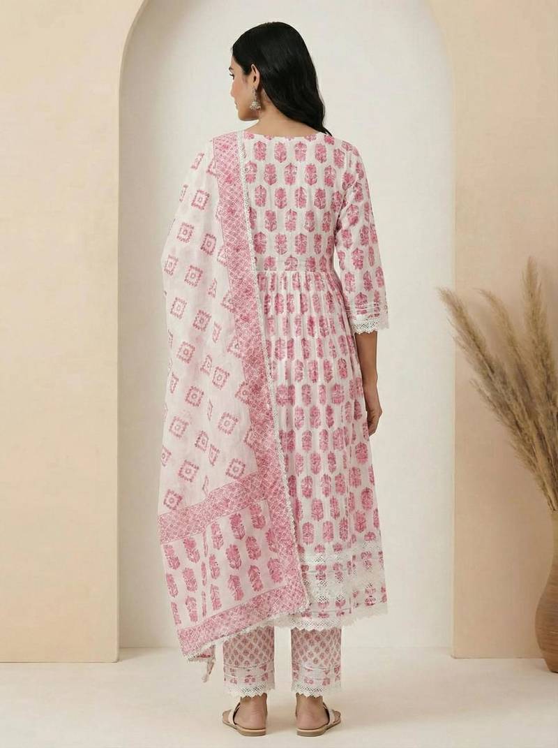 | Product Name | White Pink Block Print Cotton Kurta Set With Lace Dupatta | |