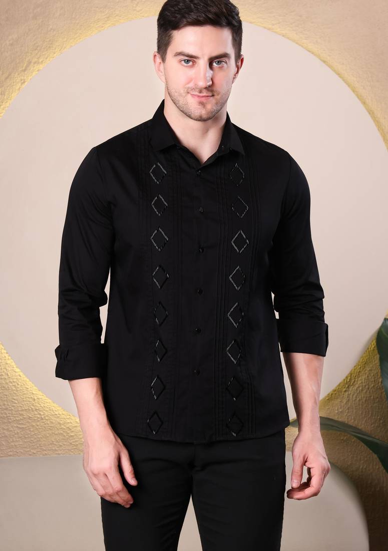 | Product Name | Pier Seven Black Slim Fit Cotton Blend Shirt With Hand Embroidery & Pin Tuck Detailing (Pwy069) | |