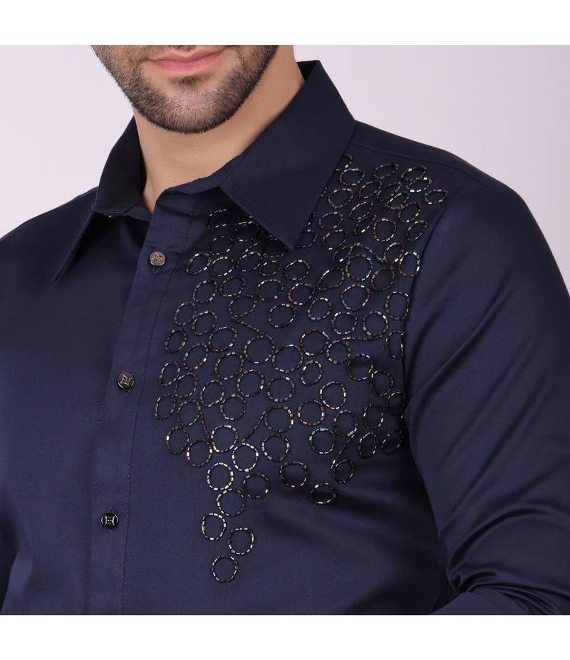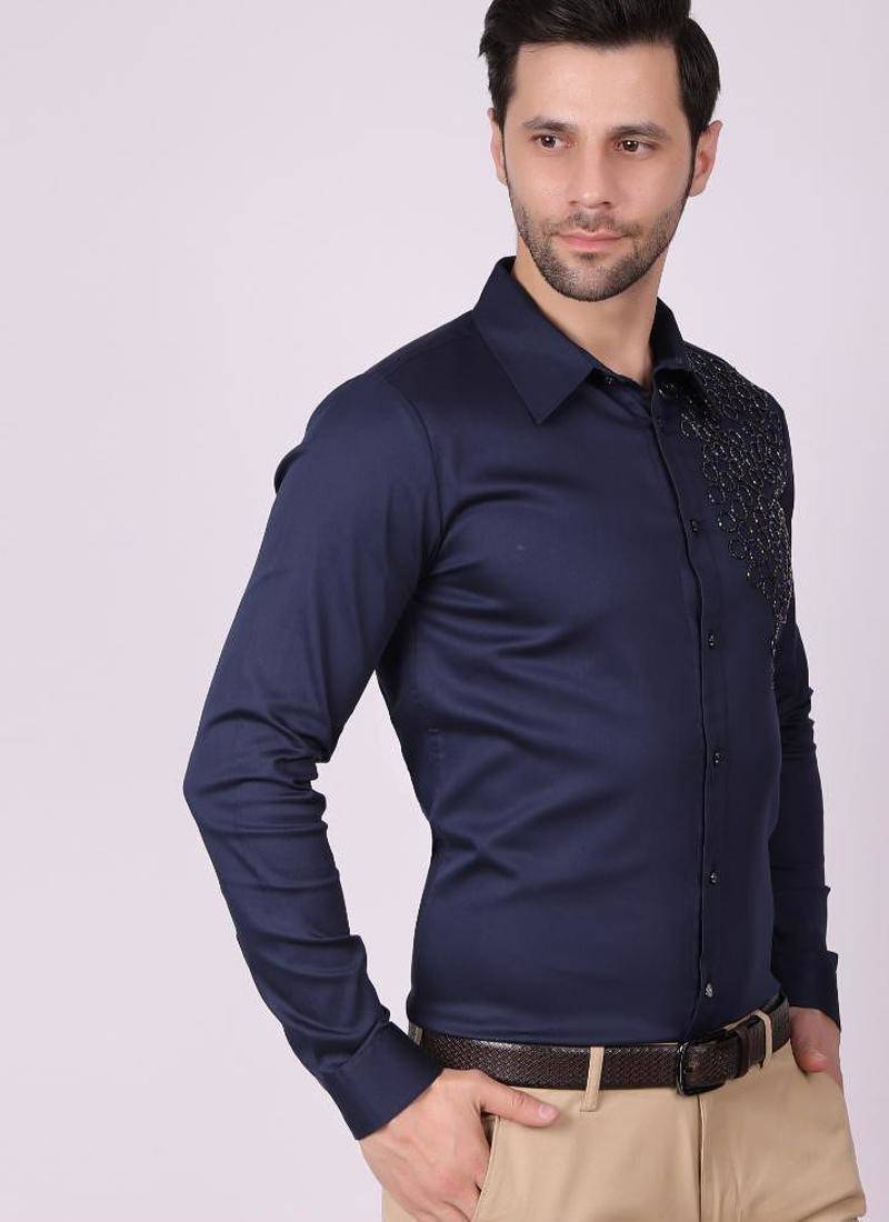 Pier seven men's cotton satin bead work slim fit shirt - navy blue (pwy003)