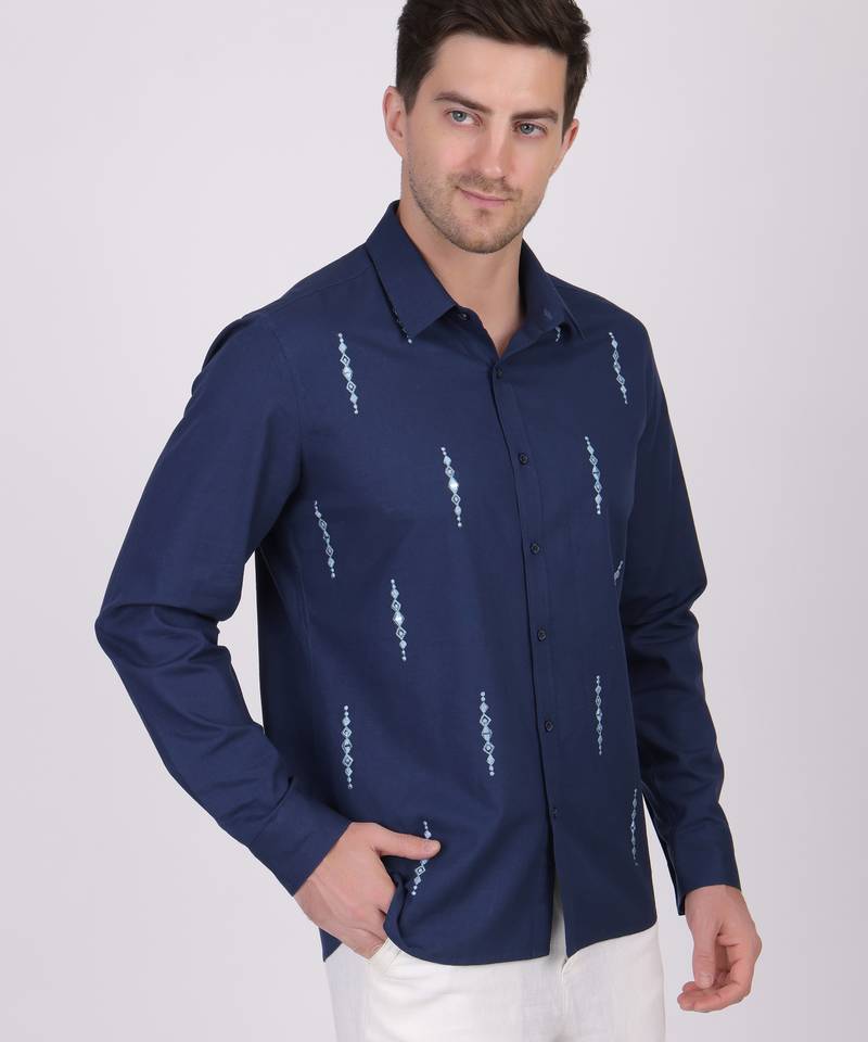 Pier seven mirror hand embroidered 100% cotton men's slim fit full sleeve shirt - navy (pwe009)