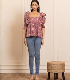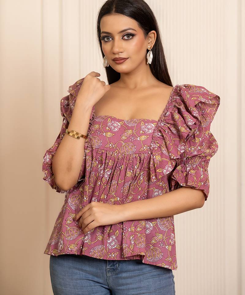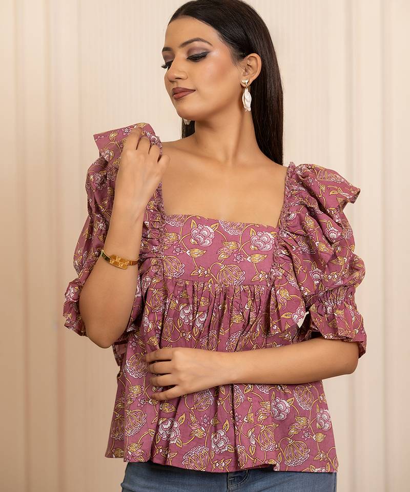 The Mauve Printed Cotton Top Showcases Soft Prints On Breathable Cotton Fabric For Everyday Comfort. Designed With A Flattering Silhouette, It Is Ideal For Casual Outings, Festive Lunches, And Relaxed Social Gatherings With Subtle Elegance And Feminine Charm.