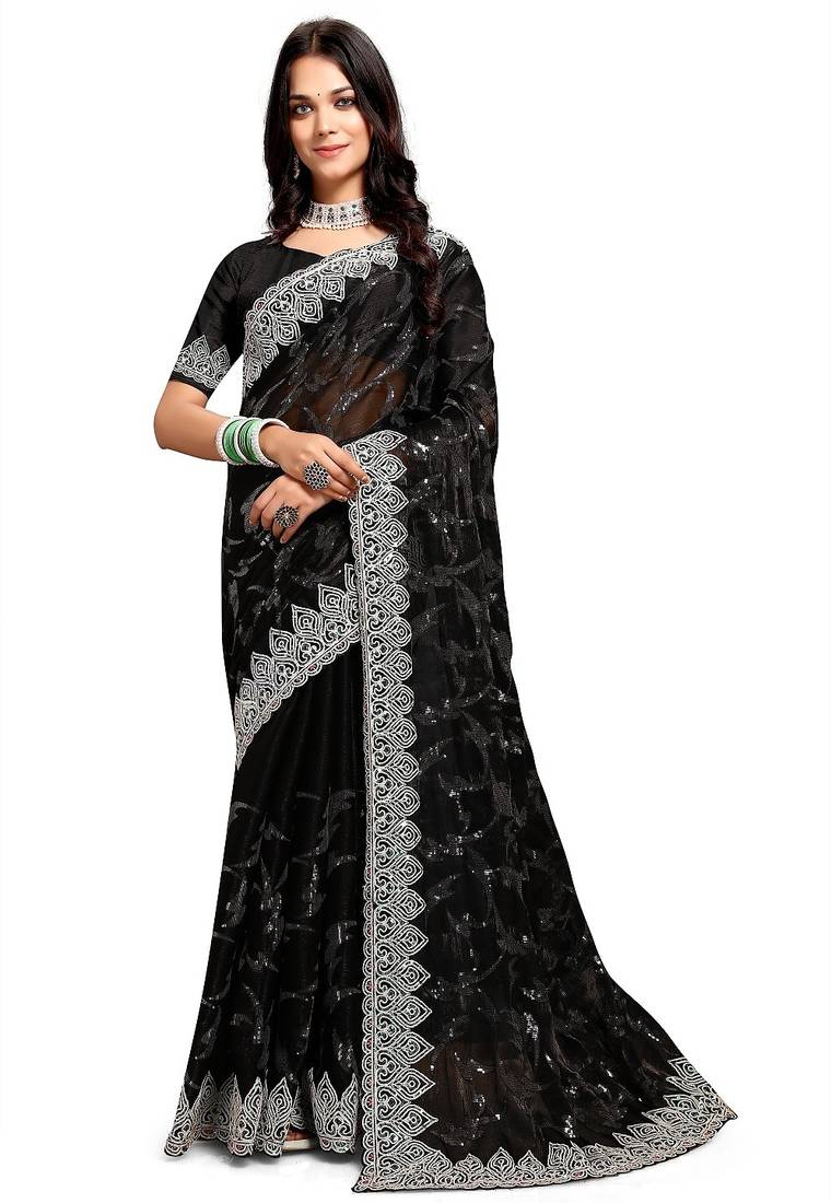 Black coloe embroidered orgenza designer saree with un-stitch blouse