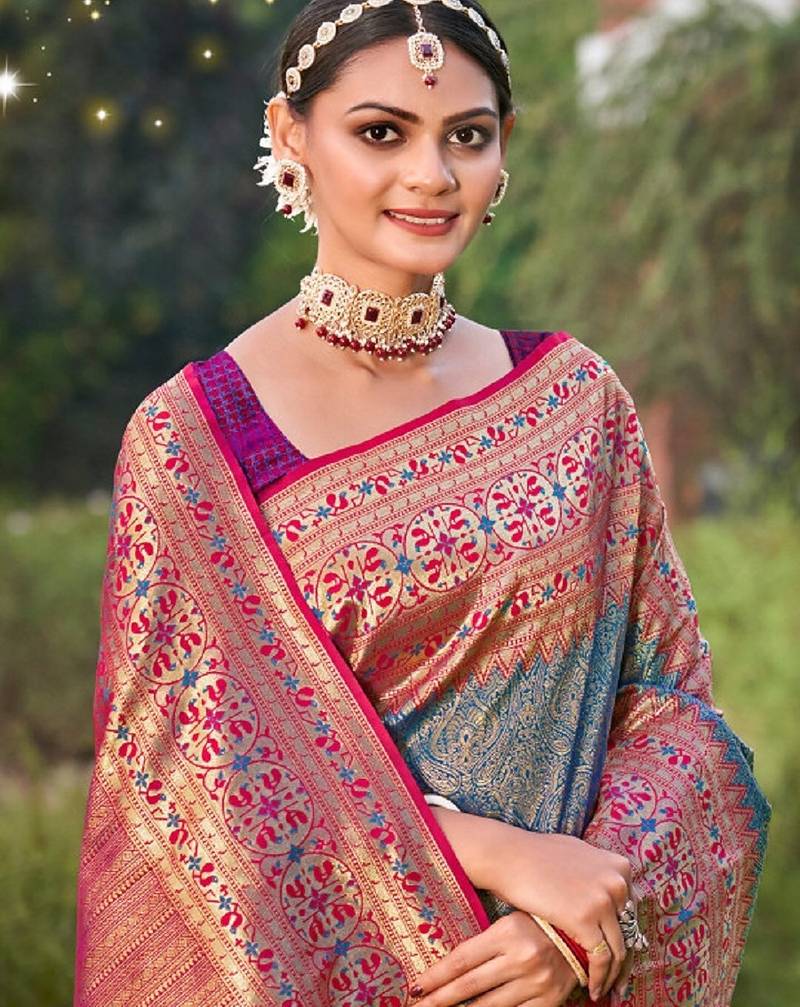 Blue color banarasi silk blend woven weaving work saree