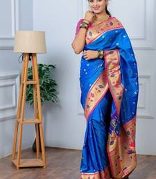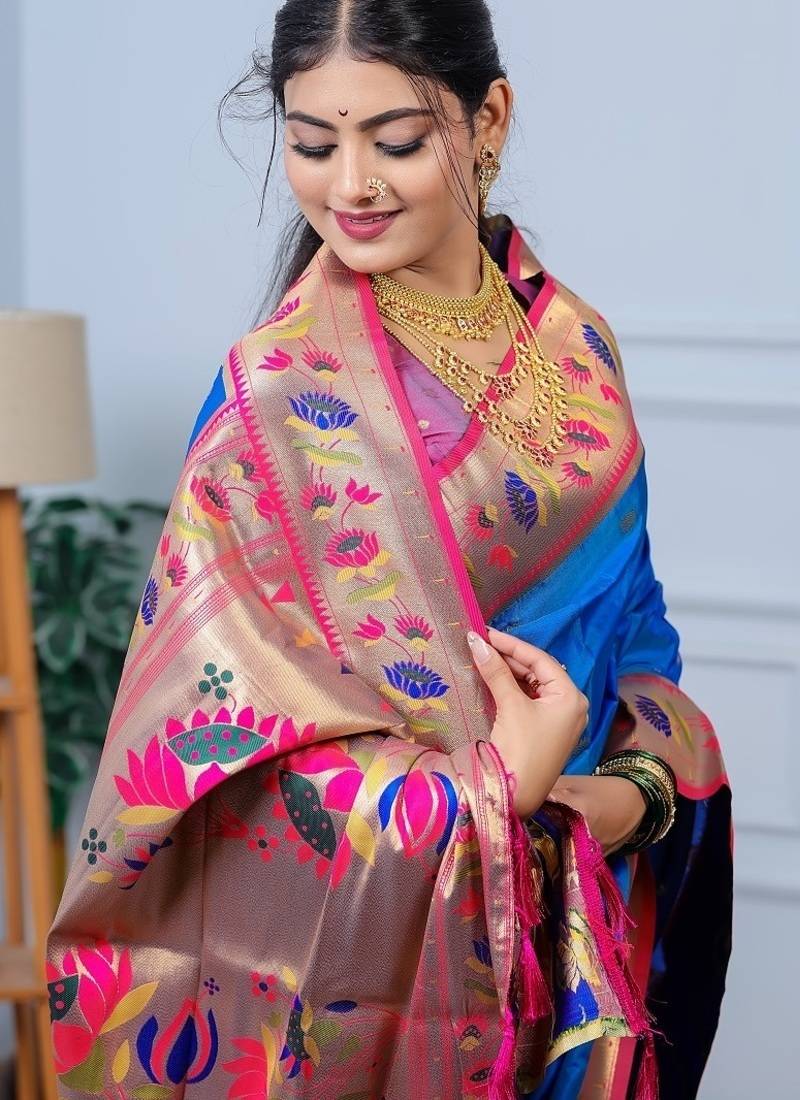Blue color weaving paithani gold copper zari weaving meenakari border saree