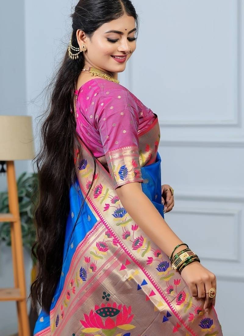 | Product Description | Pradeep Fashion Premium Pure Soft Silk Fabric Weaving Lotus Pethani Saree Pure Gold Copper Zari Weaving Lotus Pallu Meenakari Lotus Border Sari With Brocade Zari Blouse |