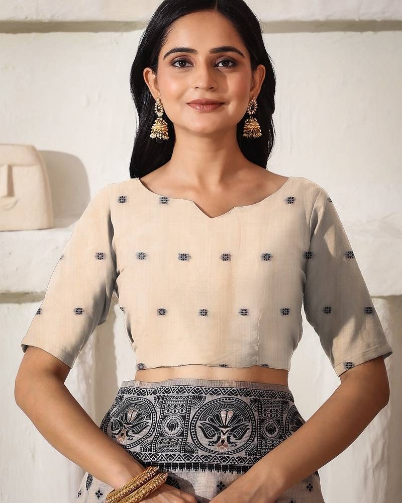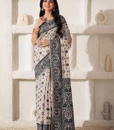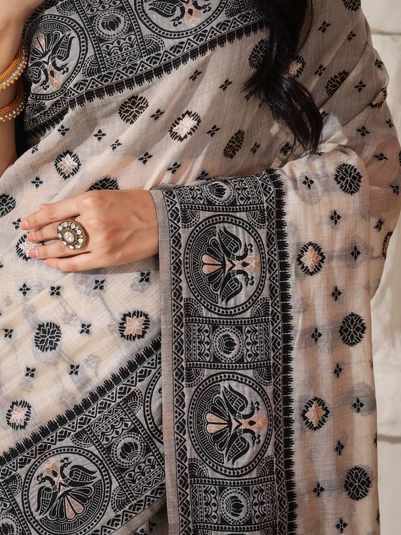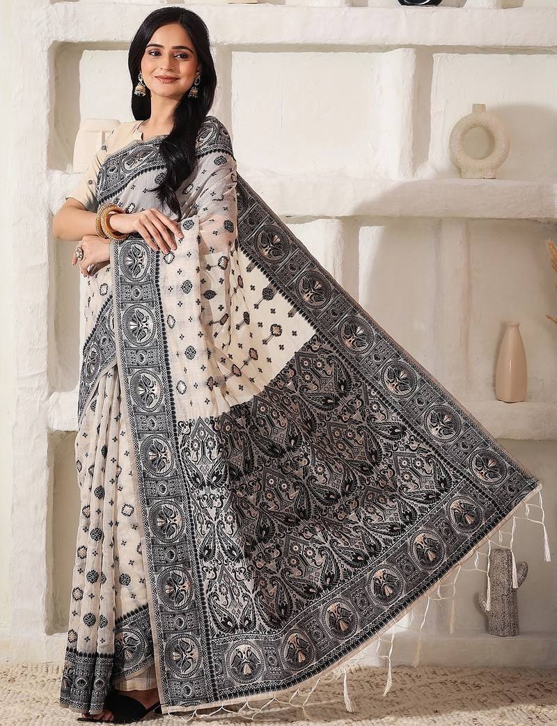 Product Name Cream & Black Color Linen Cotton Saree With Blouse