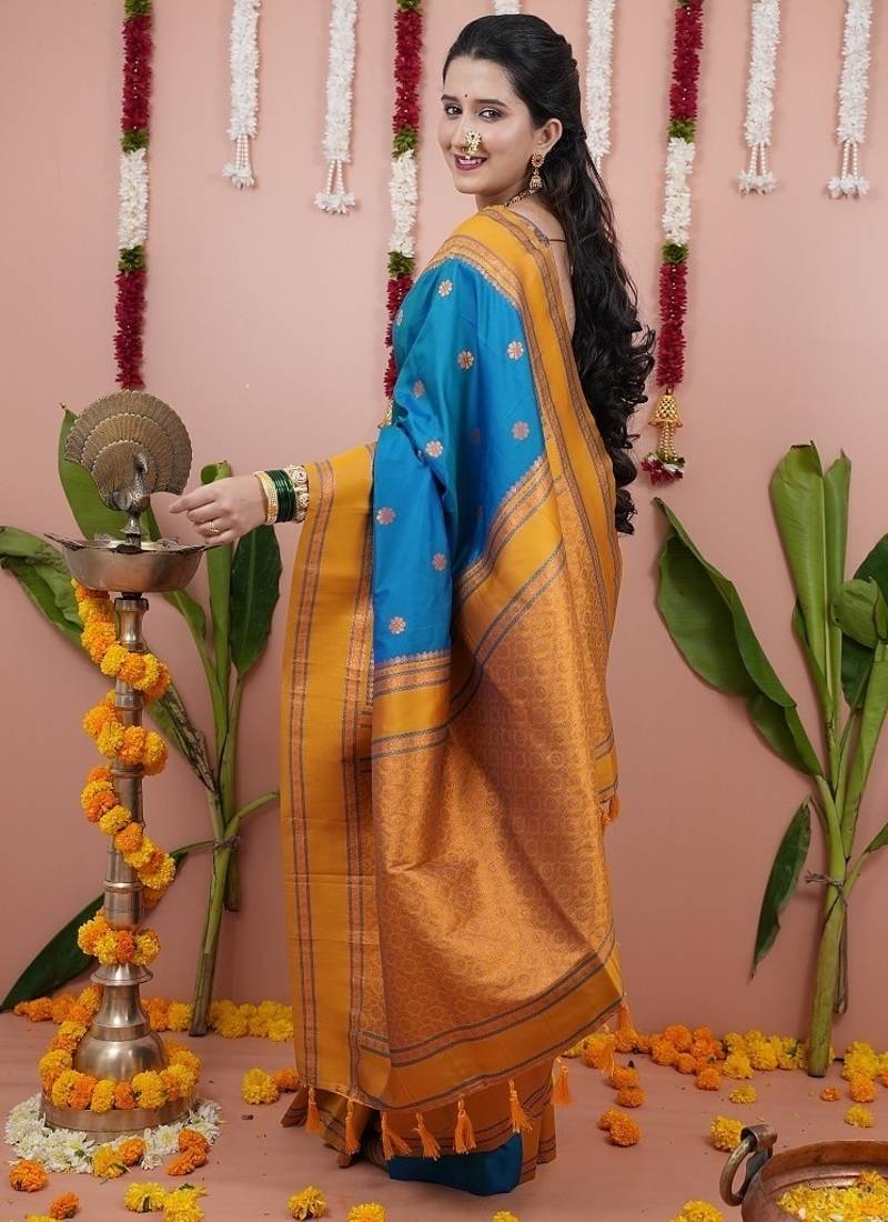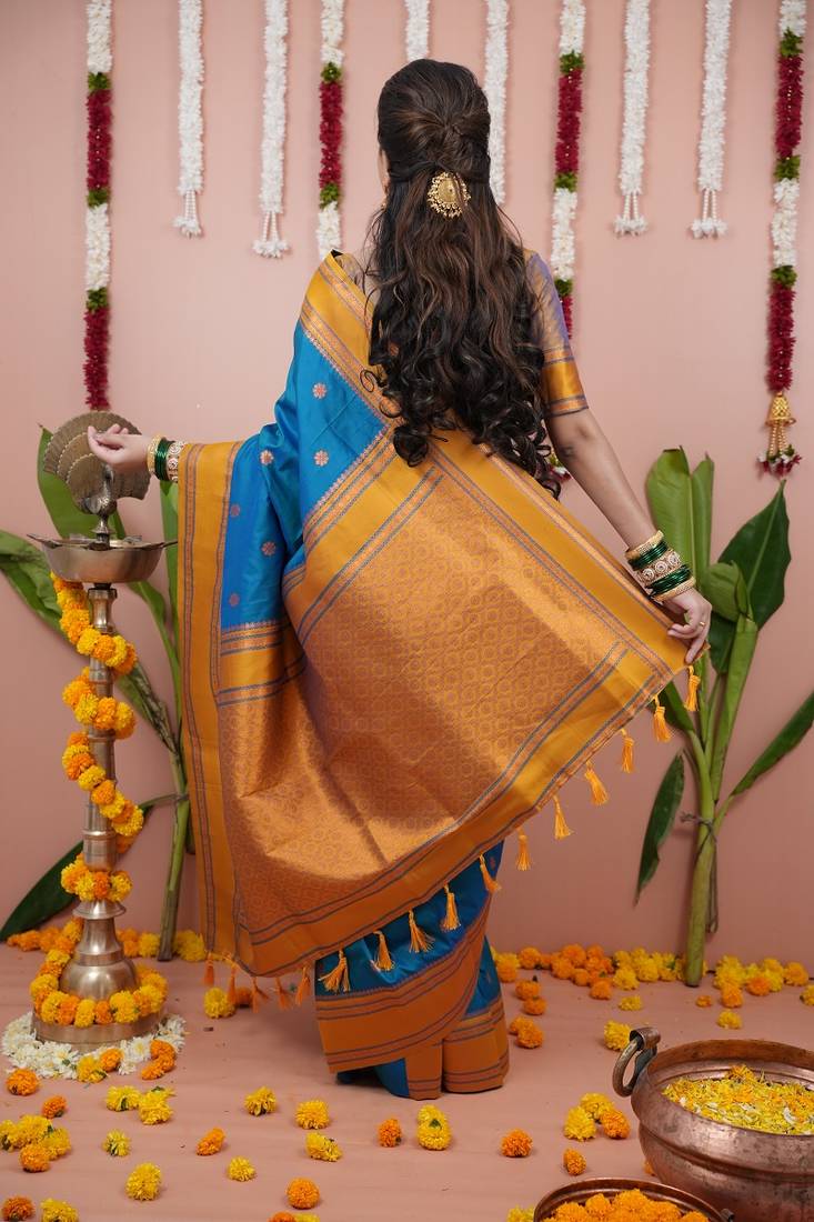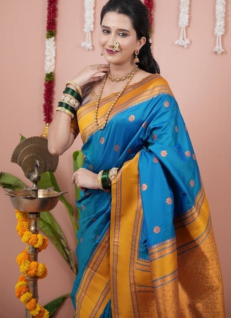 | Product Name | Dark Sky Blue Color Narayani Woven Border Zari Work Soft Silk Blend Saree | |