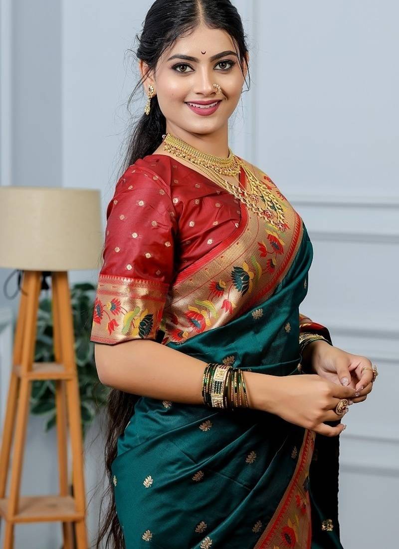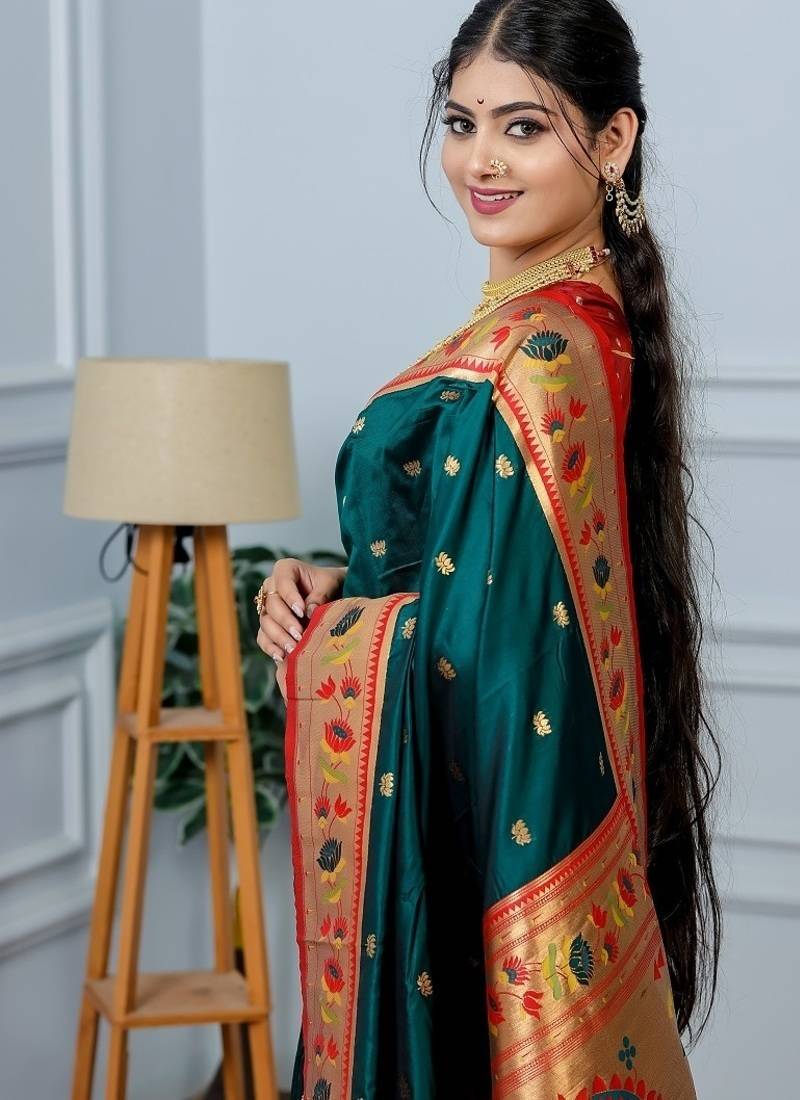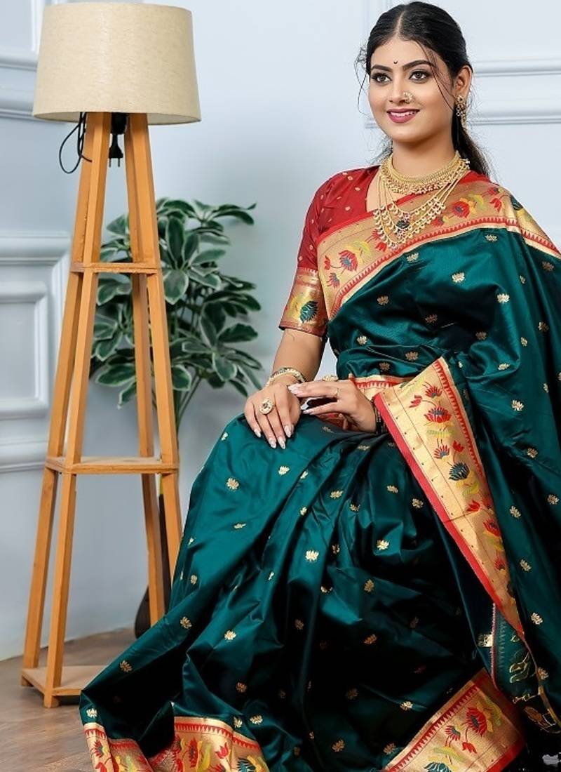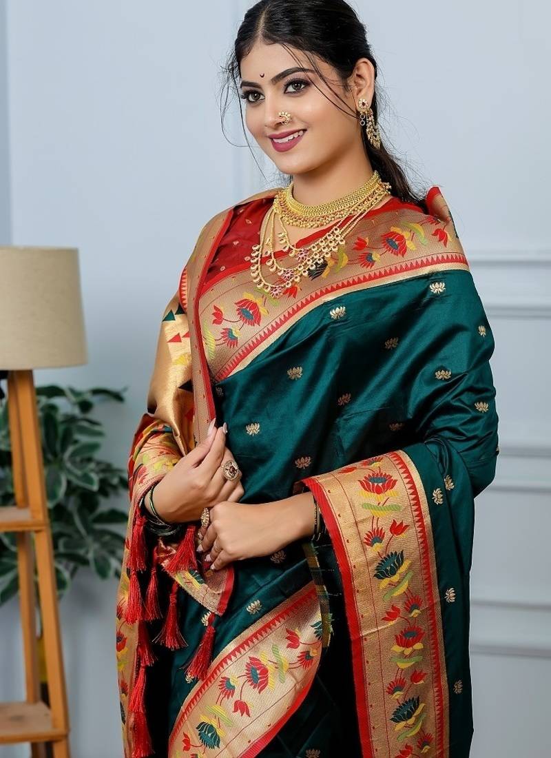 | Product Name | Green Color Weaving Paithani Gold Copper Zari Weaving Meenakari Border Saree | |
