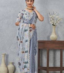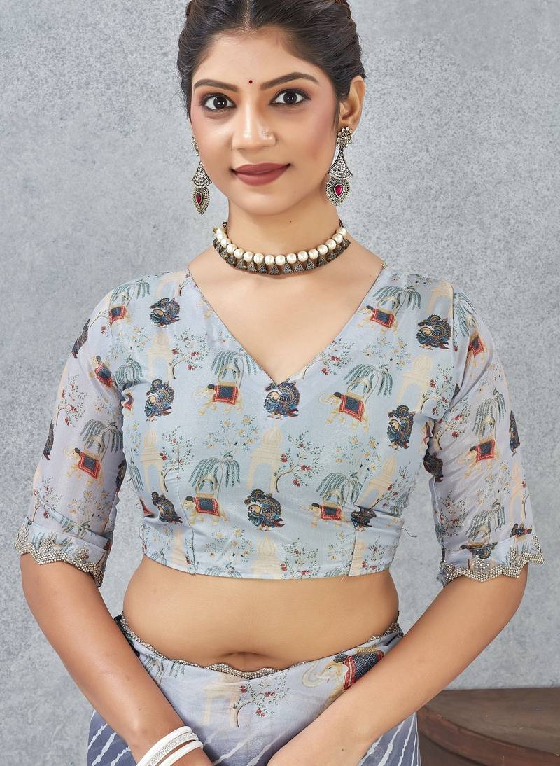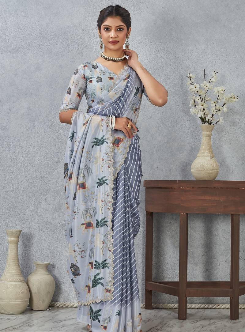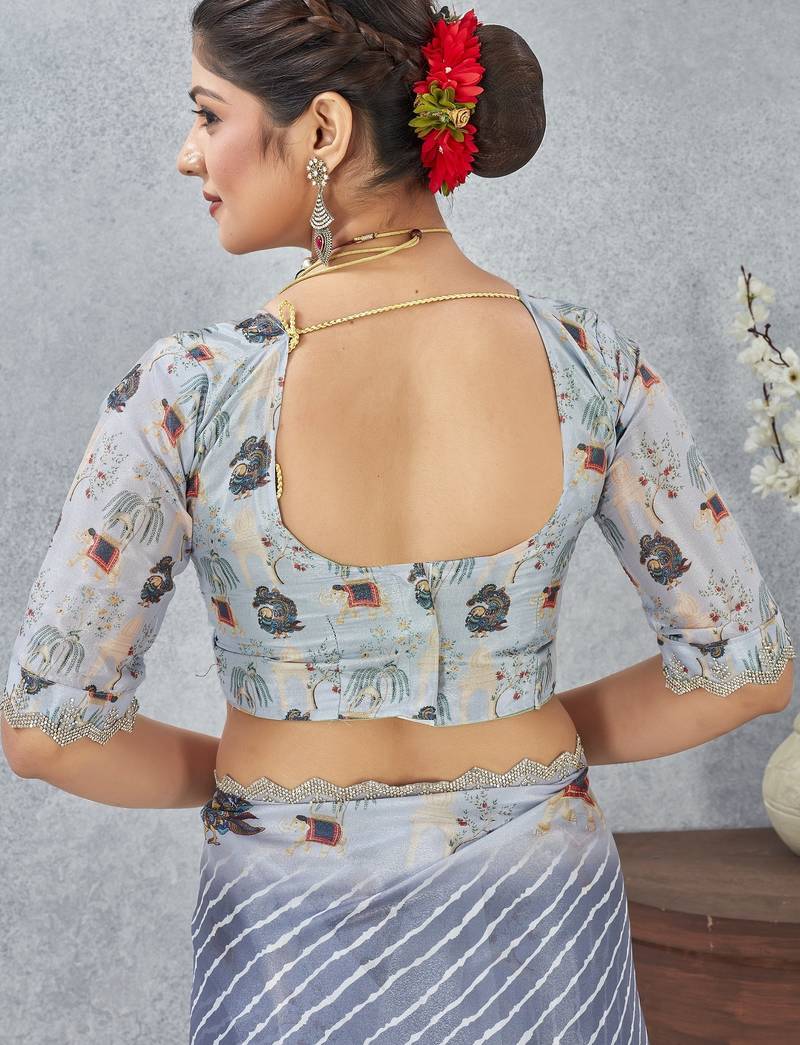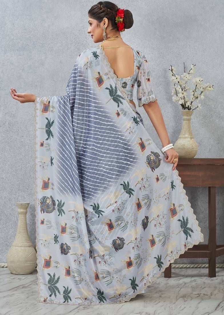 Grey color zirkon cut border worksatin digital printed saree with blouse