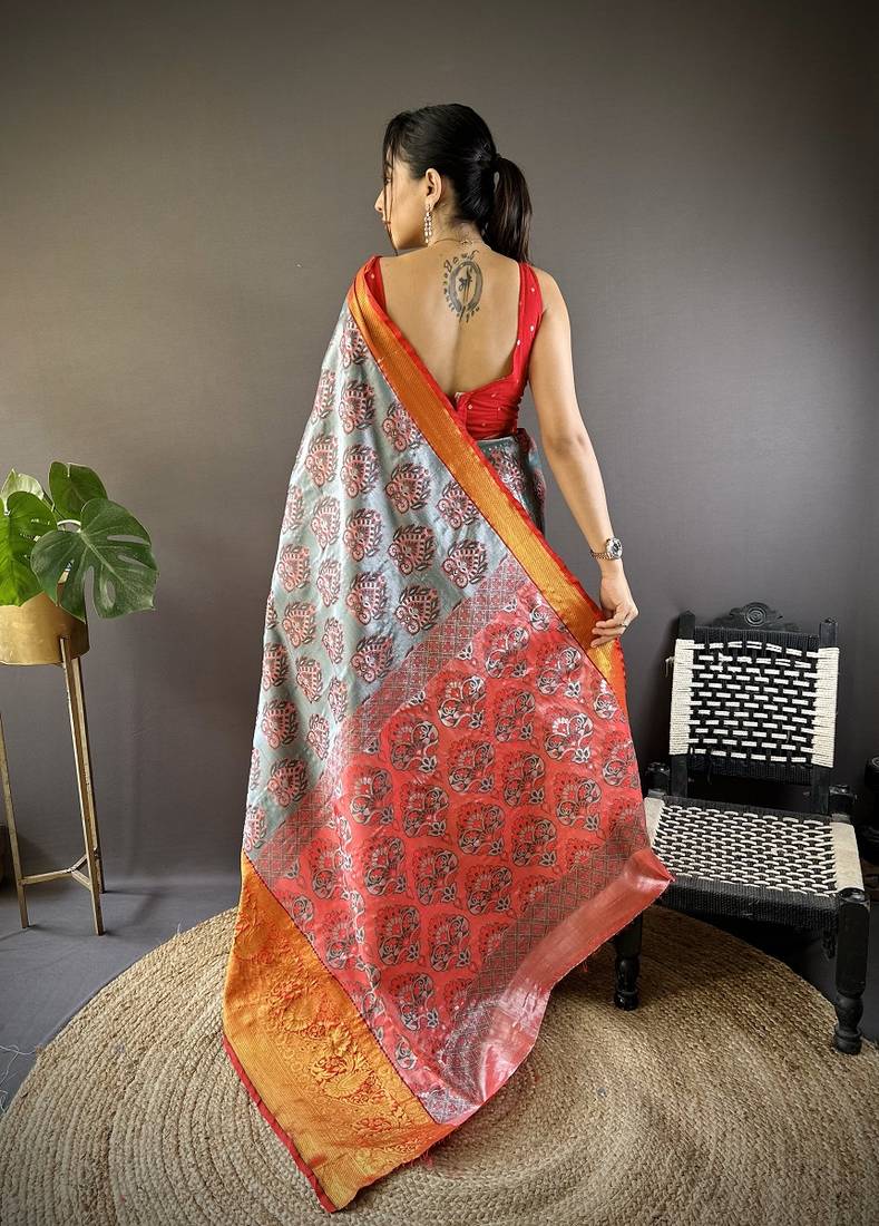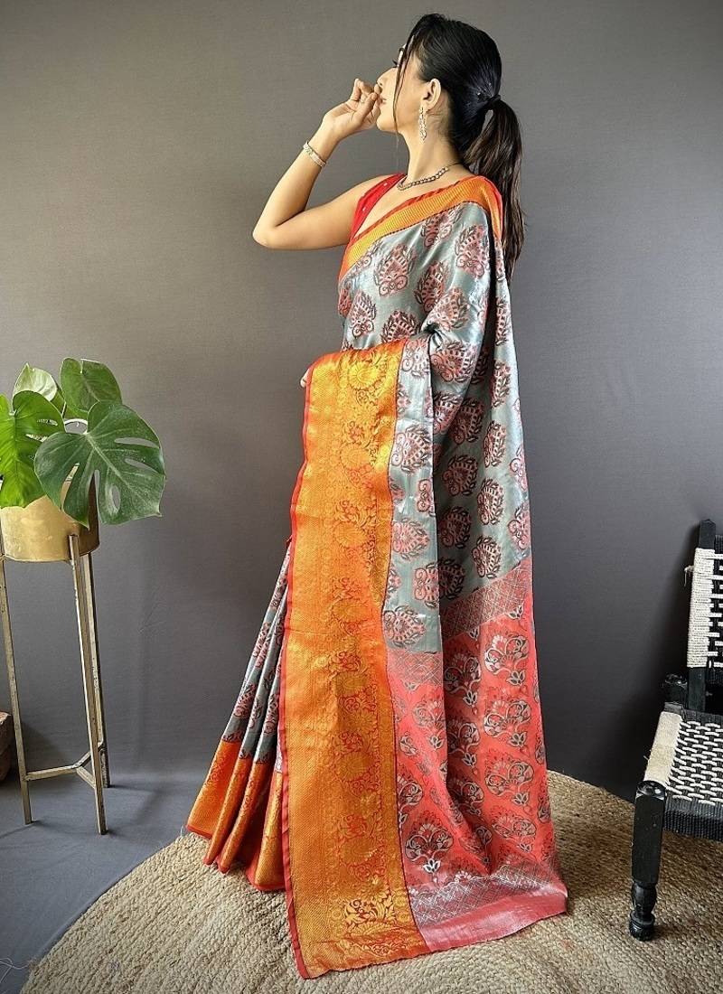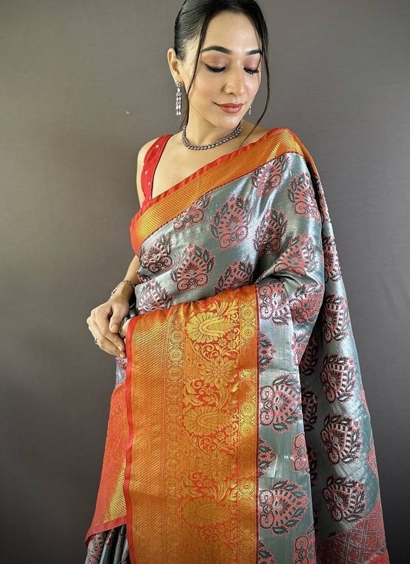 Grey & red color zari weaving work kanjivaram tissue silk saree