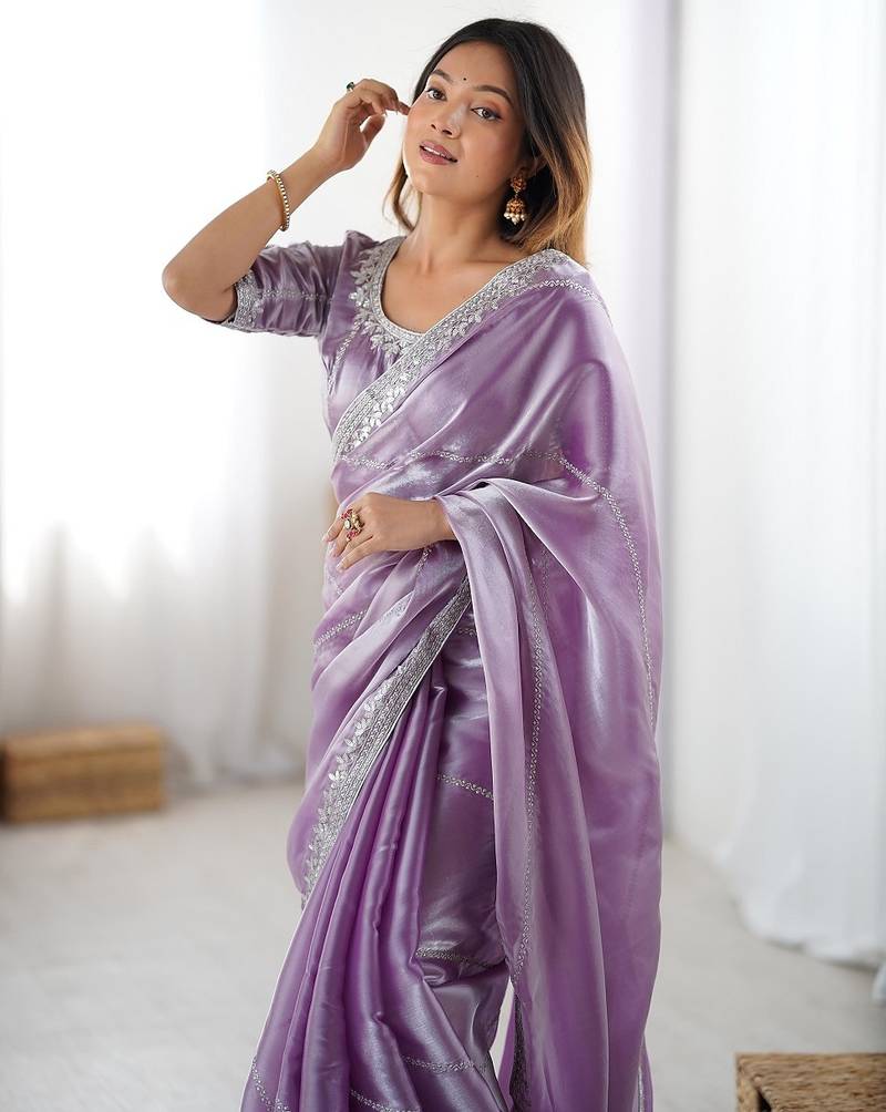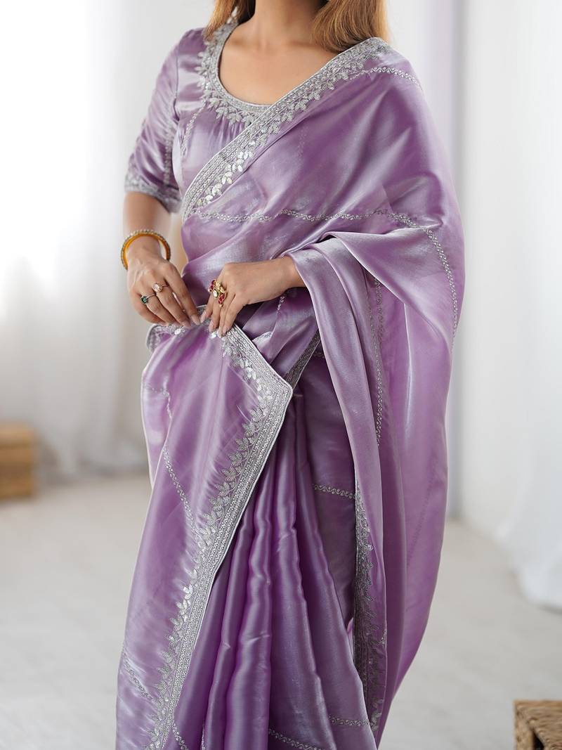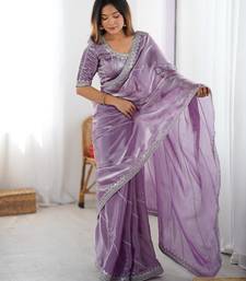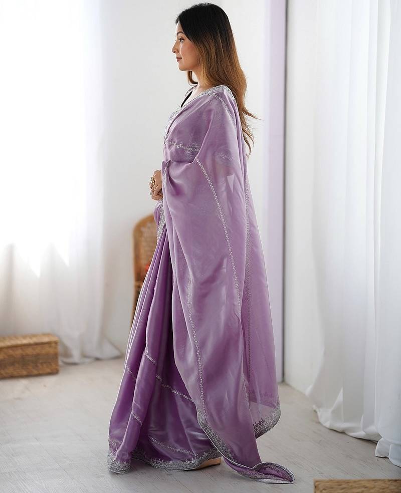 Levender color silk blend thread sequince embroidered work saree with blouse
