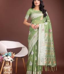 Light green color linen cotton zari weaving saree with blouse