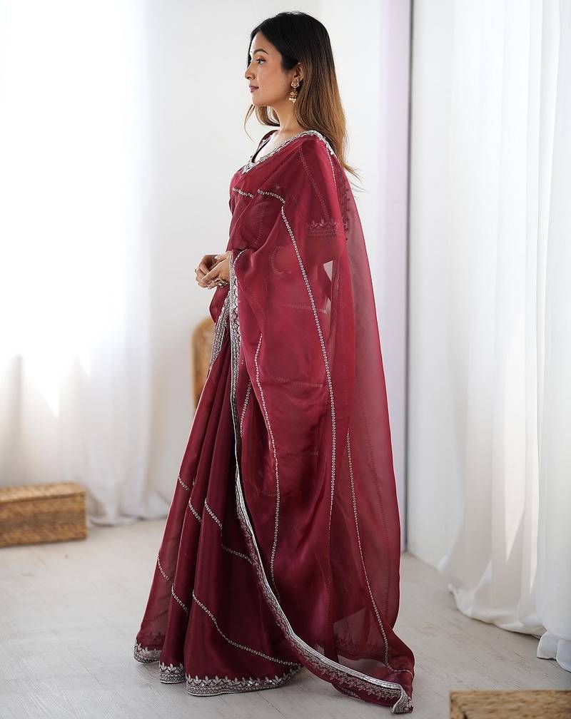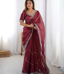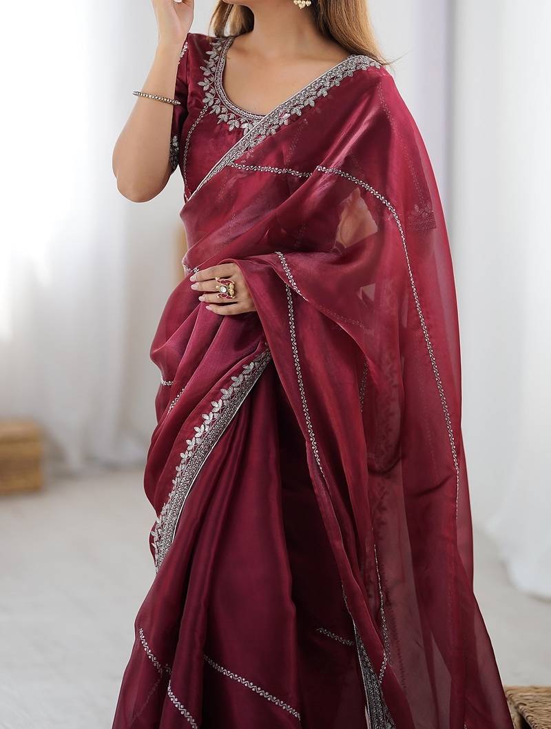 Maroon color silk blend thread sequince embroidered work saree with blouse
