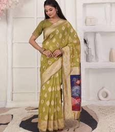 Mehandi green color woven linen cotton flower & peacock pallu saree