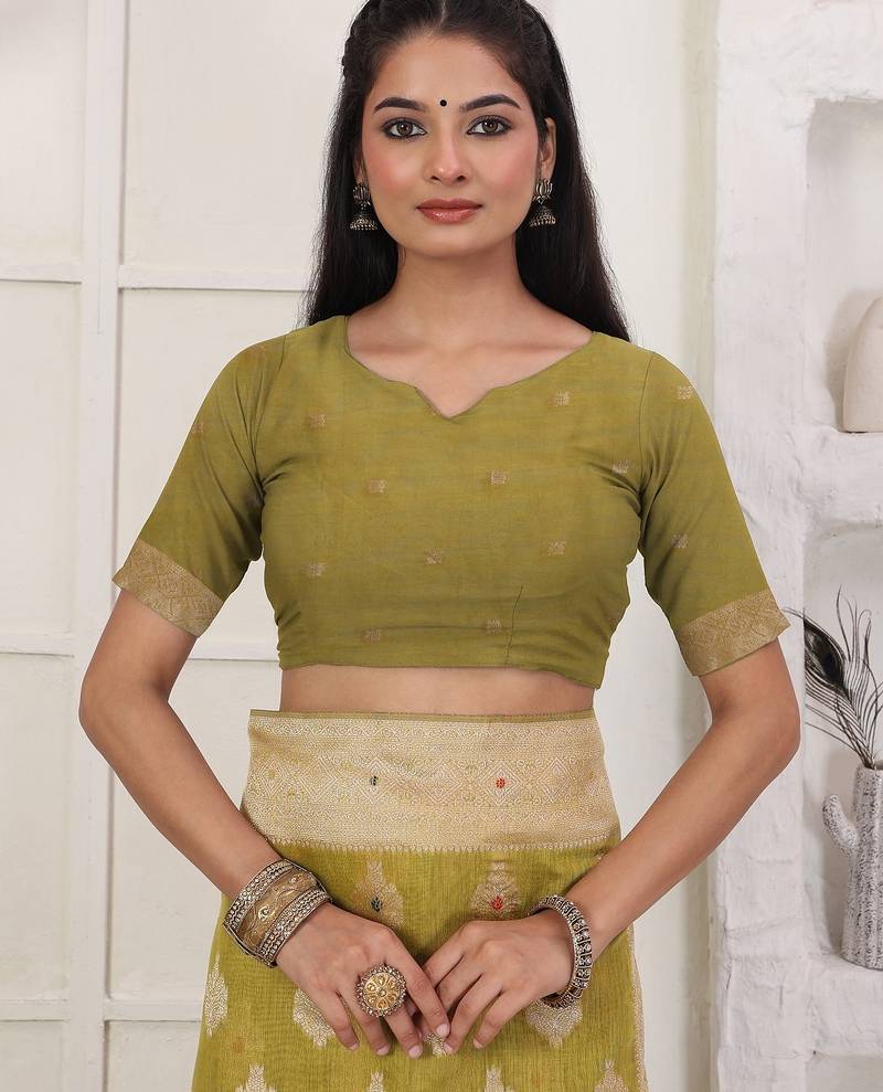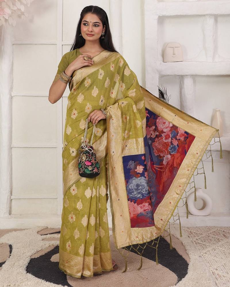 | Product Name | Mehandi Green Color Woven Linen Cotton Flower & Peacock Pallu Saree | |