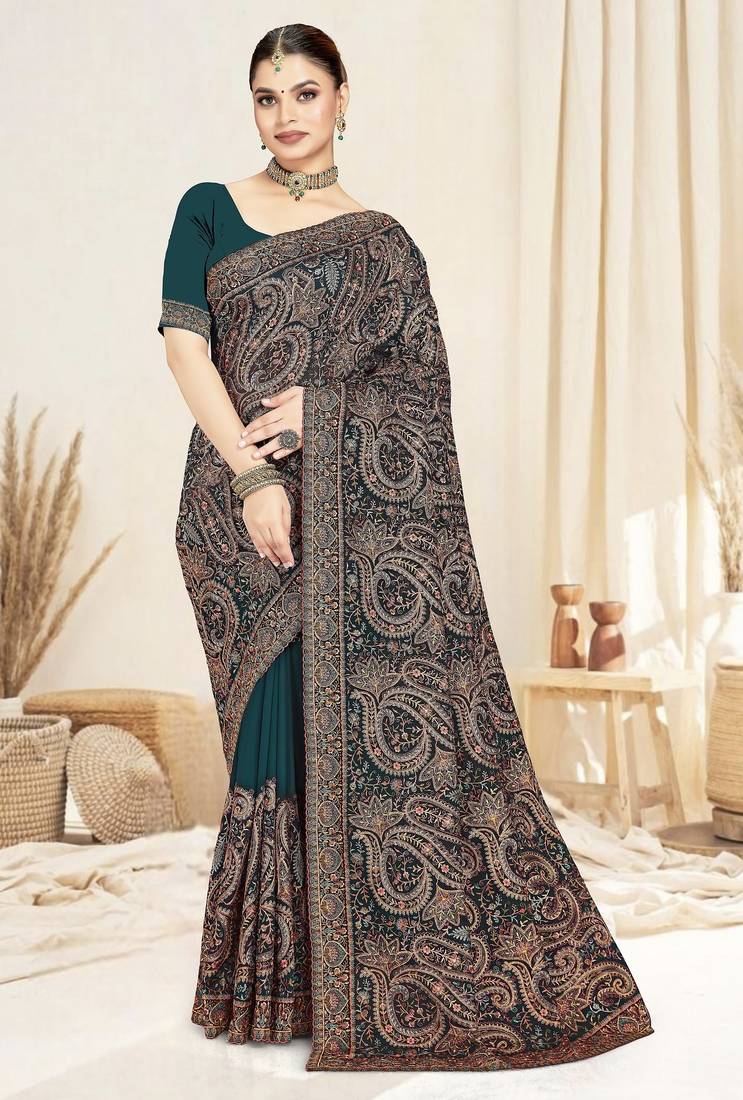 Product Description | Fancy Designer Exclusive Latest Stylish Party Wear Wedding Bridal Ethnic Tunic Georgette Resham Multi Kashmiri Embroidery Work Saree With Blouse |