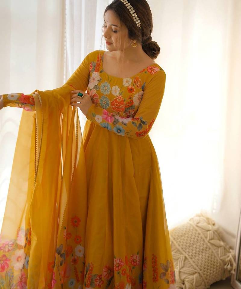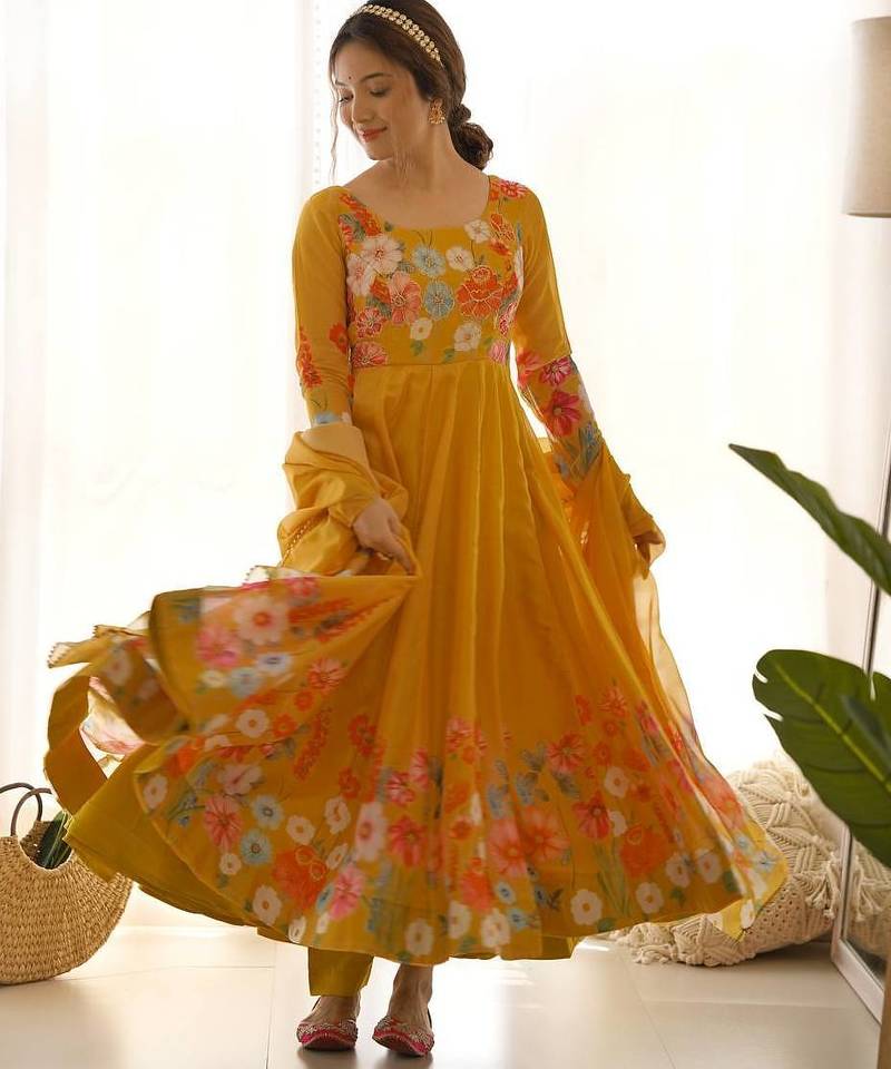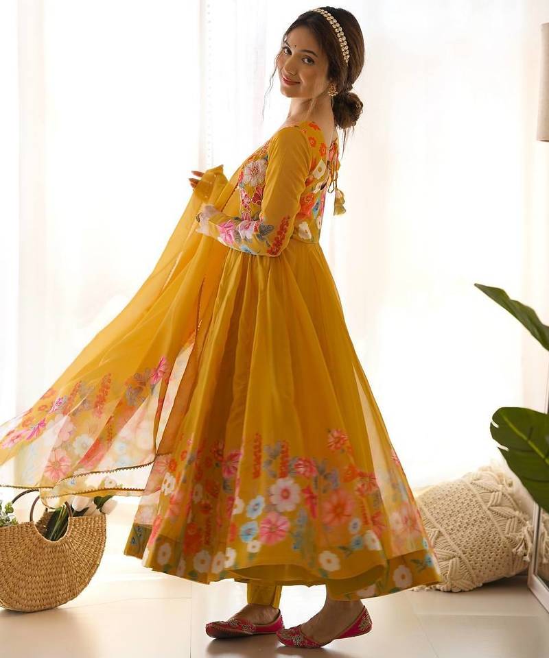 Musturd color printed & handwork orgenza silk stitched anarkali set